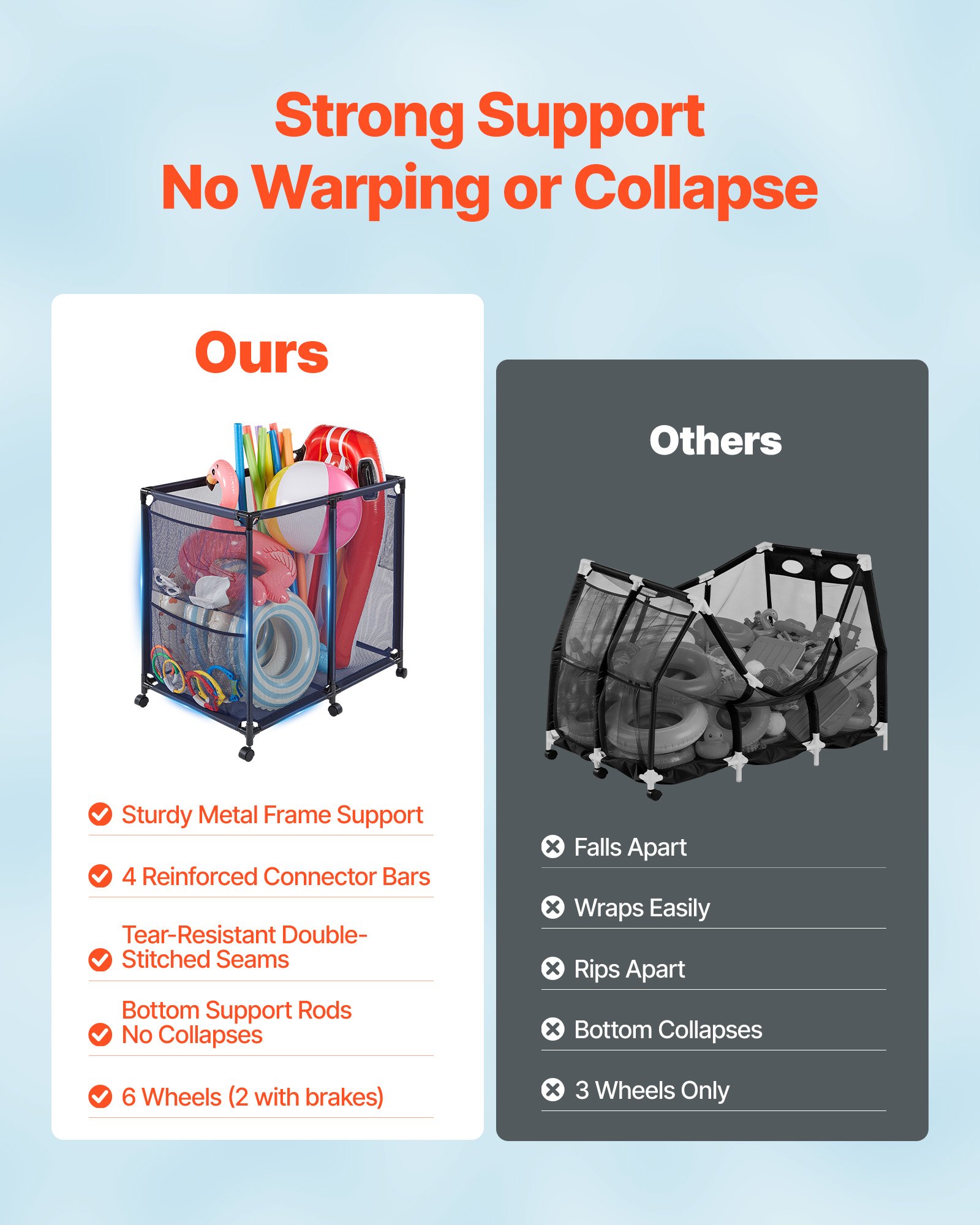 Sturdy & Durable Build: This pool toy storage is made with a reinforced metal tube frame and secure connectors to avoid sagging or bending. The polyester mesh is breathable and quick-drying—helps reduce water stain for secure storage