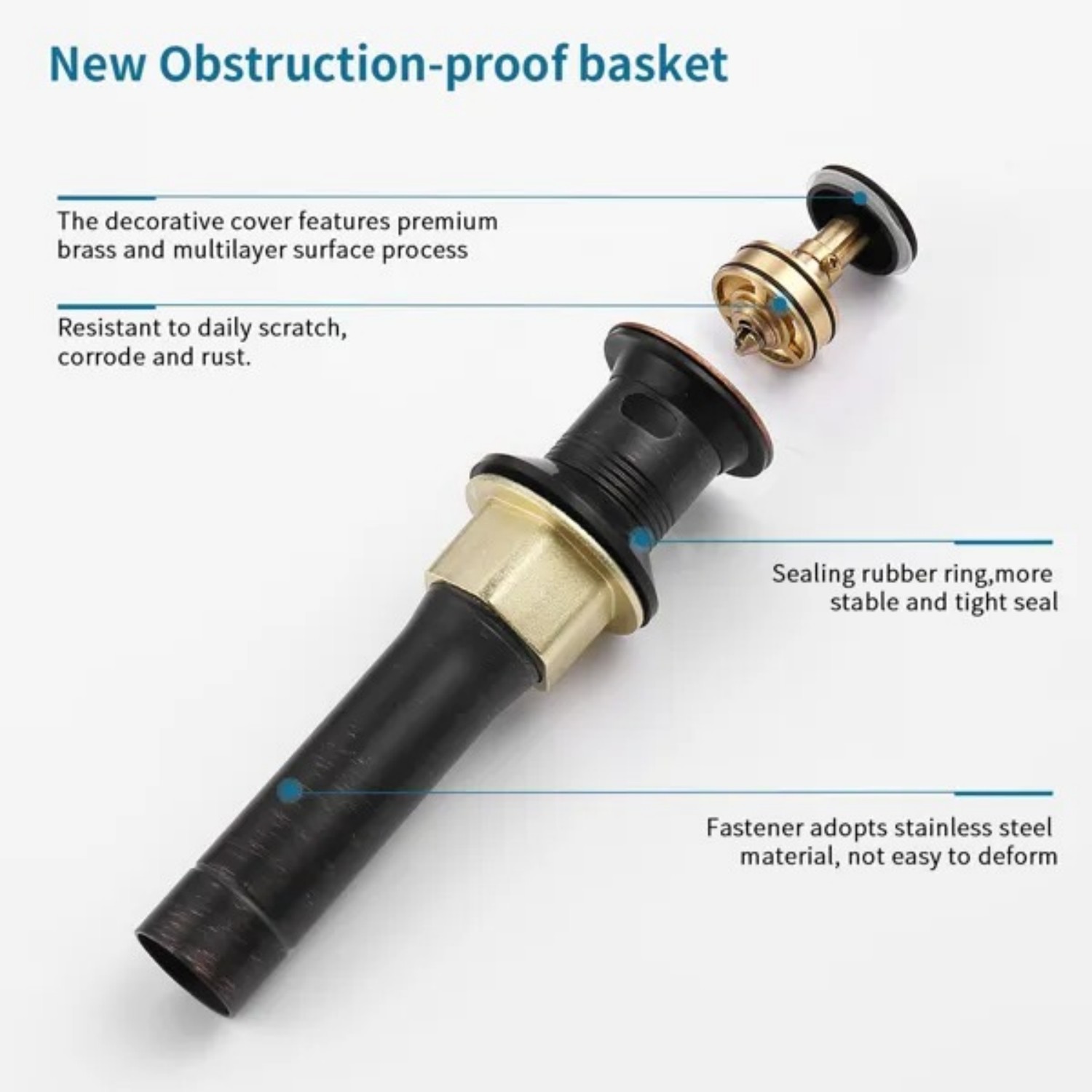 ANTI-CLOGGING DRAIN: There is an anti-clogging BRASS strainer basket inside the drain stopper, which can collect hair neatly and prevent drain pipe from clogging without affecting the drainage speed.
