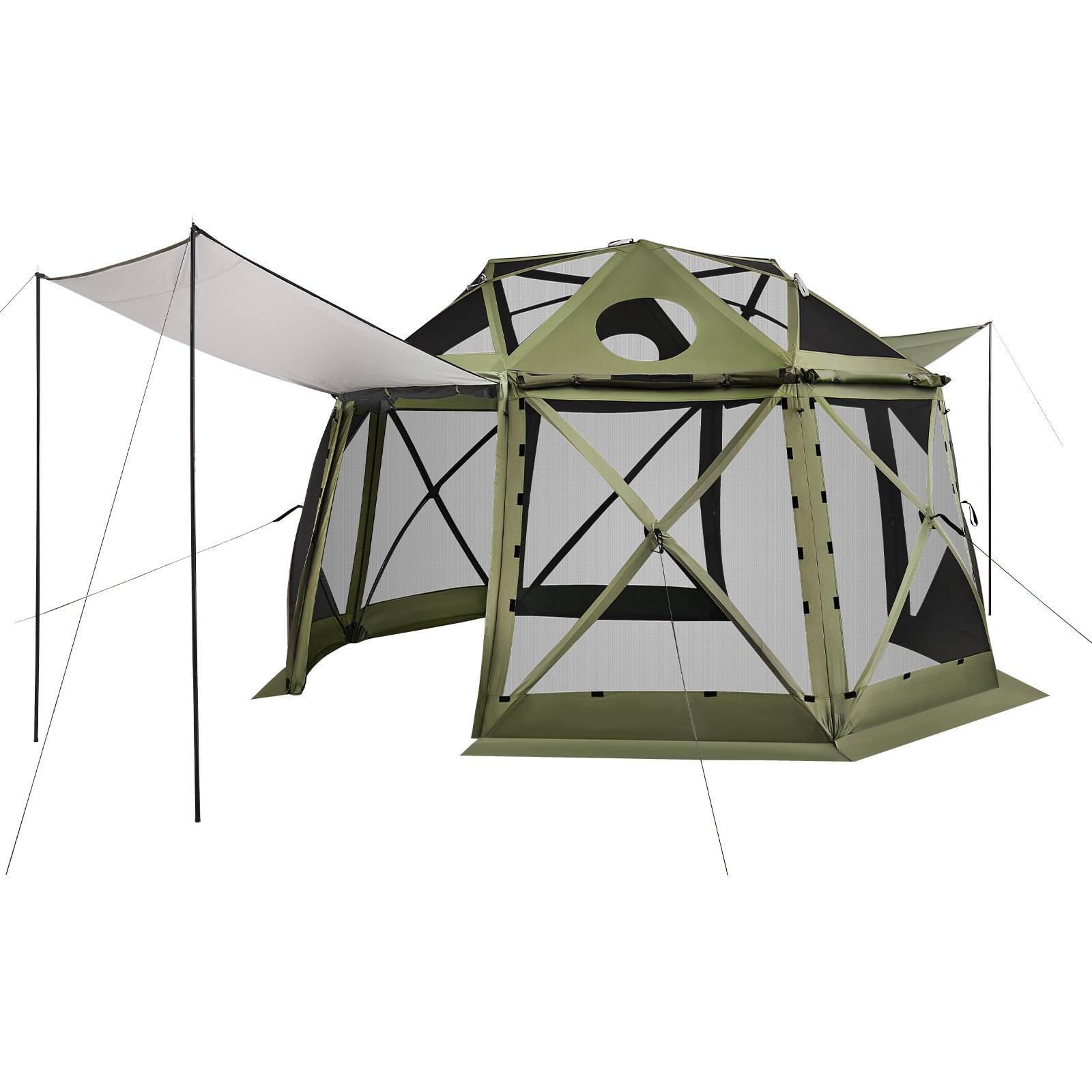 13-Sided Wind-Resistant Structure: Our canopy screen tent with reinforced geodesic design resists collapse in wind. Thickened 300D roll-up panels provide wind protection and privacy. Includes multiple stakes and guy ropes for secure ground anchoring. (Tip: For your safety, please disassemble and store it during storms or heavy rain.)