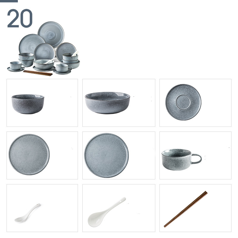 20-piece set B: 5.5-inch rice bowl*1+8-inch flat plate*3+7-inch soup bowl*2+10.5-inch flat plate*2+6-inch disc*2+small soup spoon*4+ mug*2+ Large spoon *1 + wooden chopsticks *5 pairs