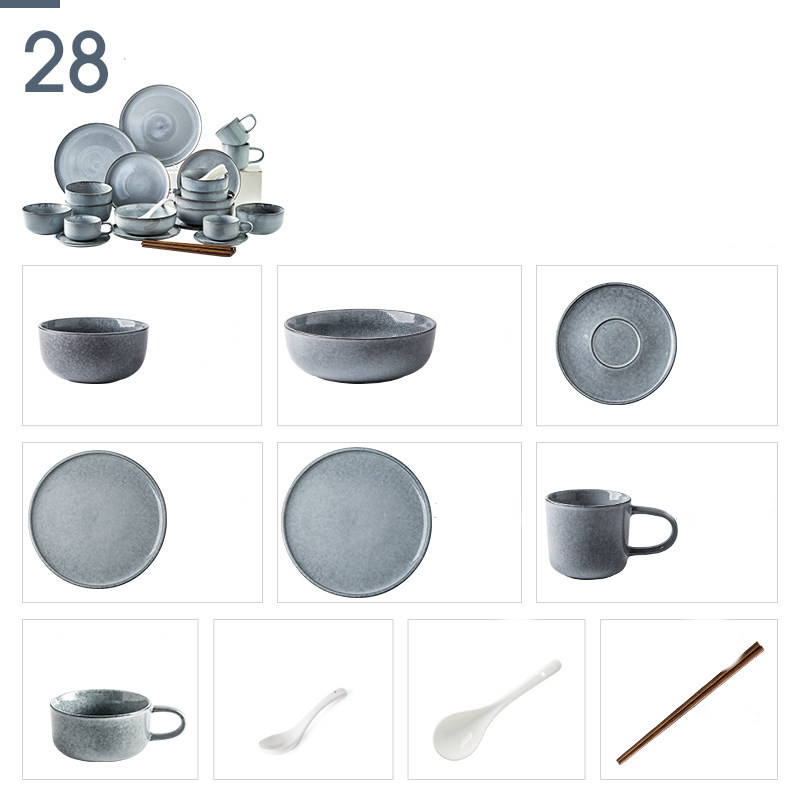 28-piece set: 5.5-inch rice bowl*6+8-inch flat plate*4+7-inch soup bowl*3+10.5-inch flat plate*2+6 inch disc*2+small spoon*6+short mug cup*2+high mug cup*2+large spoon*1+short mug cup*2+wood chopsticks*10 pair