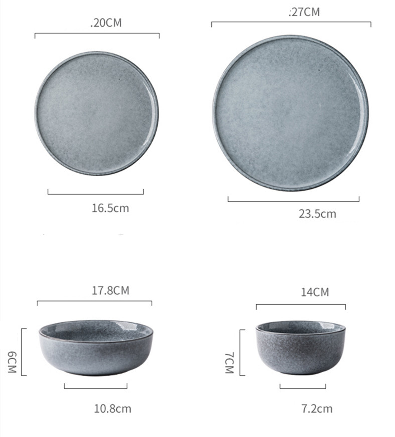 12-piece set A: 5.5-inch rice bowl*2+6-inch round plate*2+ mug tall cup*2+7-inch soup bowl*1+8-inch flat plate*1+small soup spoon*2+wood chopsticks*2