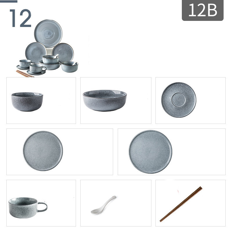 12-piece set B: 5.5-inch rice bowl*2+7-inch soup bowl*1+6-inch round plate*2+ mug with handle*2+8-inch flat plate*2+10.5-inch flat plate*1+ Small soup spoon*1+wooden chopsticks*5 pairs