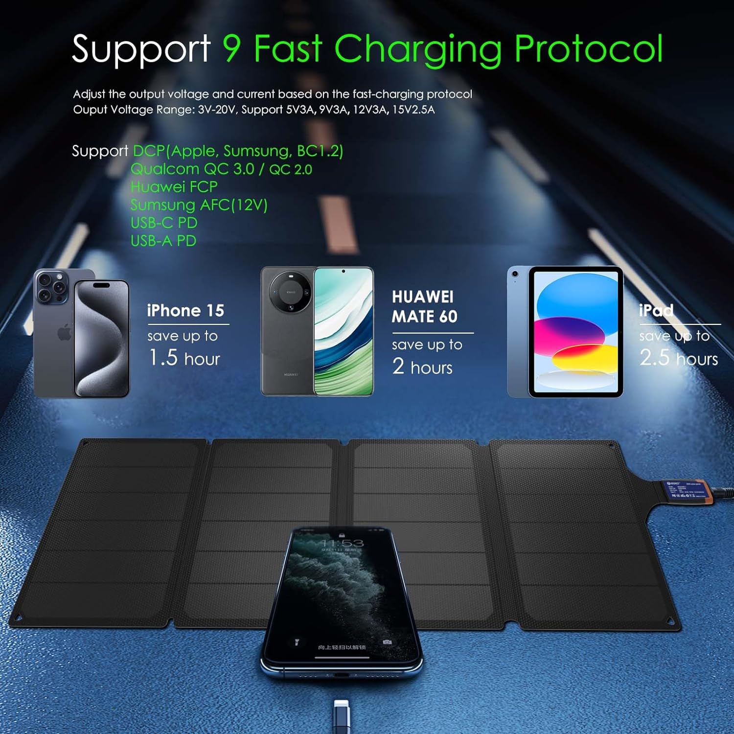 【High Conversion Efficiency】 Ericsity solar panel 36w with SUNPOWER silicon solar cells has excellent efficiency performance which is 30% higher than the ordinary solar panel. The matte surface of the small particle ETFE material can reflect more sunlight into the solar cell chips which can convert up to 24% of solar power into free energy in enough sunlight. This solar power phone charger is the most high efficiency with newset SUNPOWER solar panel cell at present.