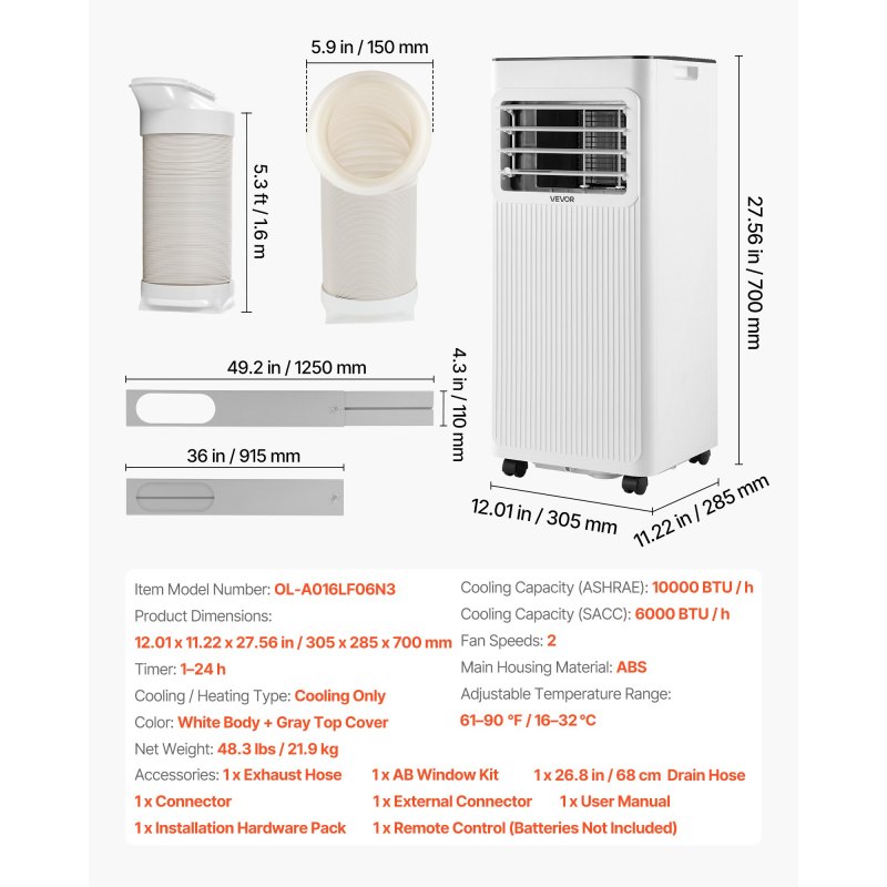 Easy Setup: Designed for flexible setup, this portable ac includes an adjustable window panel fitting window widths from 36-49.2 in / 915-1250 mm and a 5.3 ft / 1.6 m exhaust hose. The ac unit can be quickly installed in different rooms