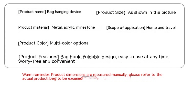 Product features: Bag hook, foldable design, ready to use at any time, worry free and convenient