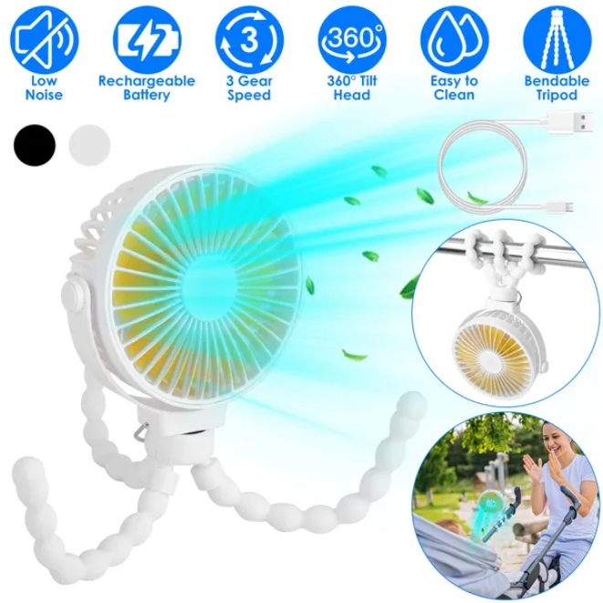 Portable Baby Stroller Fan Rechargeable Handheld Fan With Flexible Tripod Clip On Desktop Hanging Fan 3 Gear Speed With Tilt Head