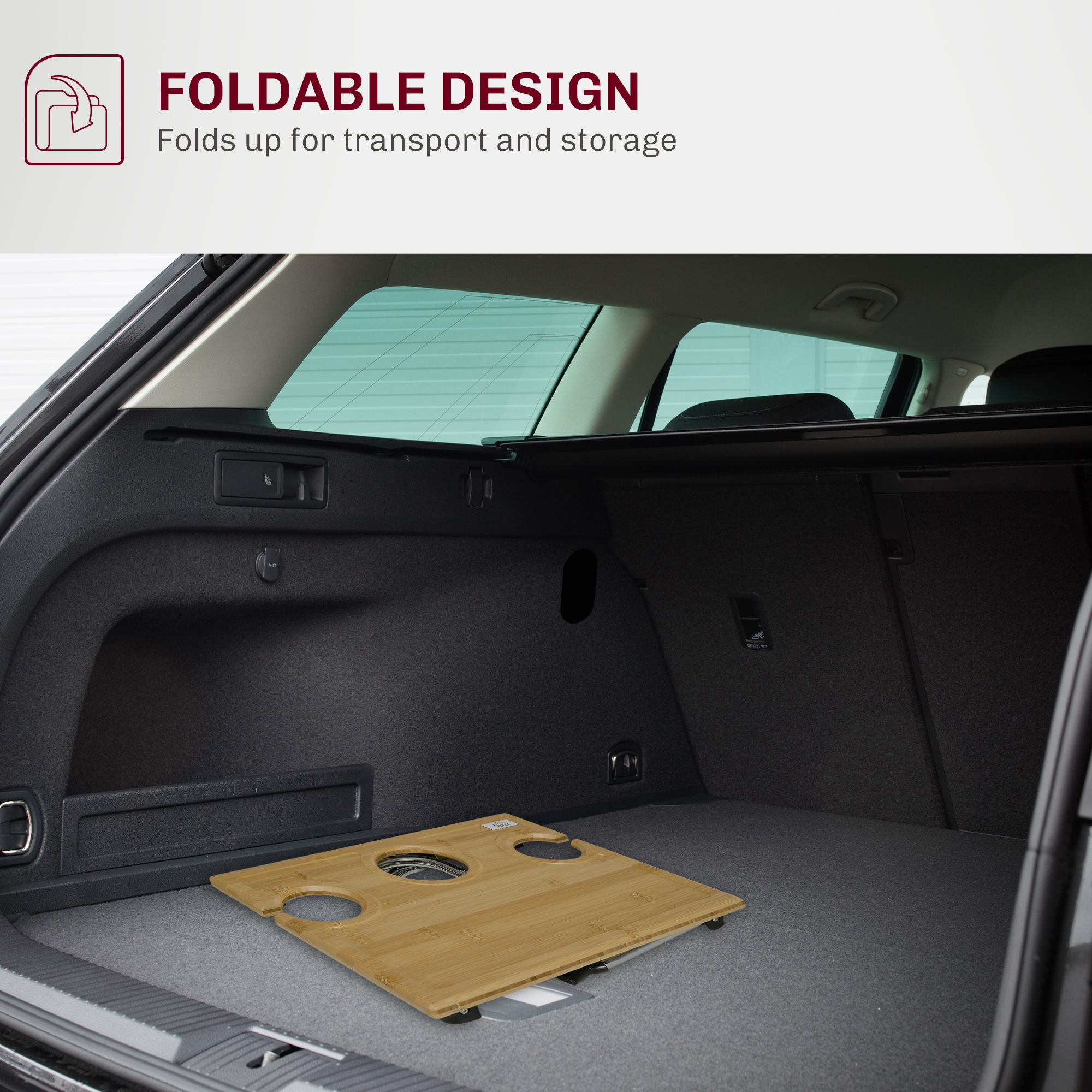 Enjoy a bottle of wine, with your favourite person - anywhere. This foldable table comes with a bottle and two glass holders - holding everything in place. The bamboo tabletop means a beautiful and tough holding surface, with a protective varnish coating. Steel legs for a supportive base. A foldable design to take with you anywhere.