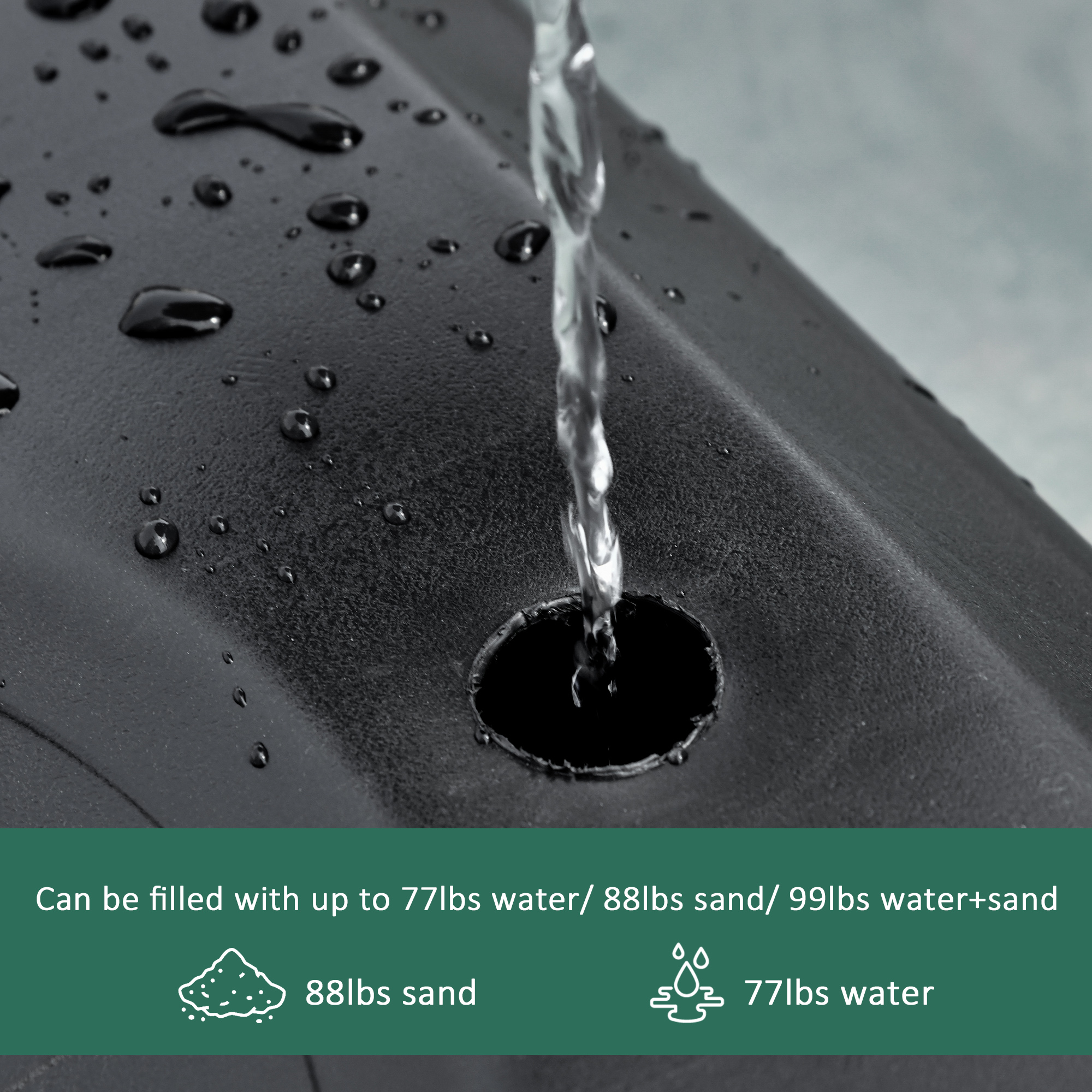 • - Bottom base can be filled with 77 lbs of water, 88 lbs of sand, or maximum 99 lbs of water and sand for added stability