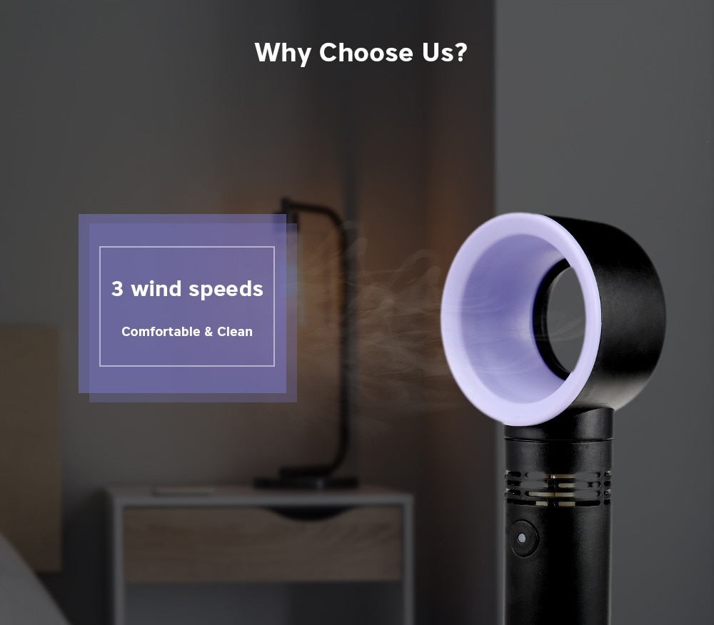 - This is a mini bladeless fan made with ABS material, easy to clean, durable in use, and with 3 speeds for meeting your needs.