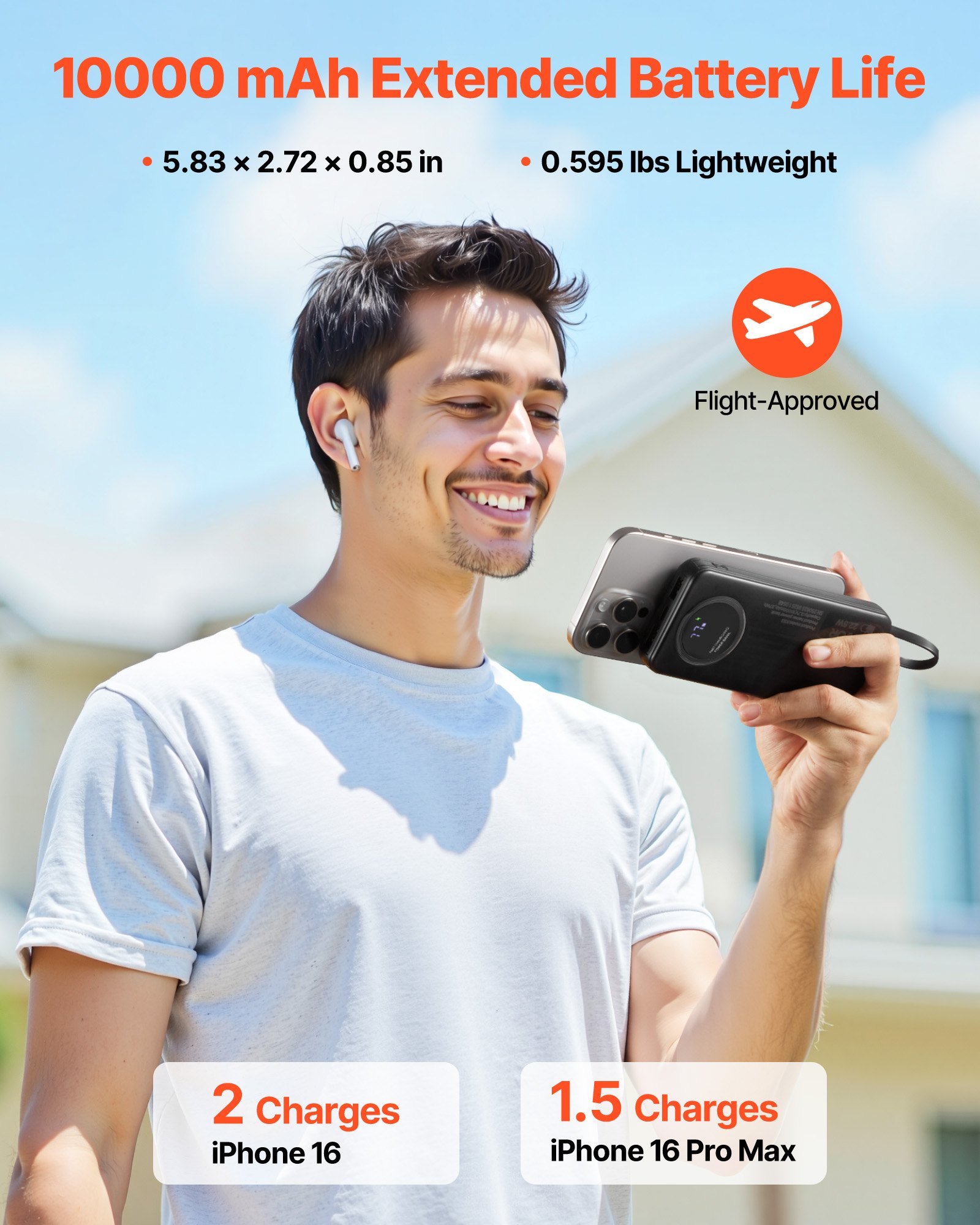 Slim Build, Big Power: Compact at 5.83 x 2.72 x 0.85 in and weighing only 0.595 lbs, the power bank with built in cables is easy to carry. With a 10,000 mAh capacity, it can charge your iPhone 16 up to 2 times or your iPhone Pro Max about 1.5 times