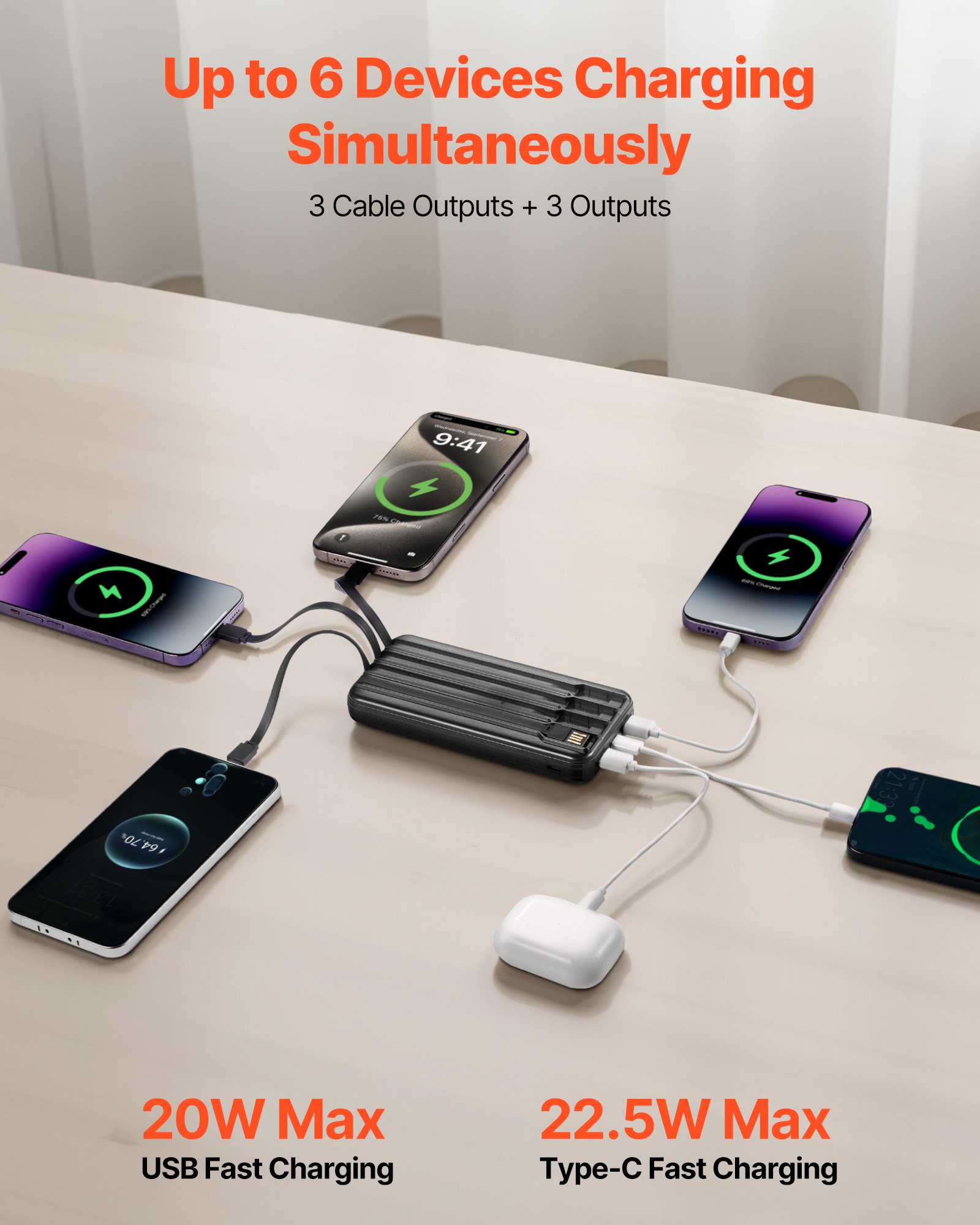 6 Outputs Fast Charging: This fast charging power bank charges up to 6 devices at once. It recharges with 3 charging options via USB, Type-C port, and built-in cable. With 20W/22.5W fast output, you’ll spend less time waiting and more time powered up