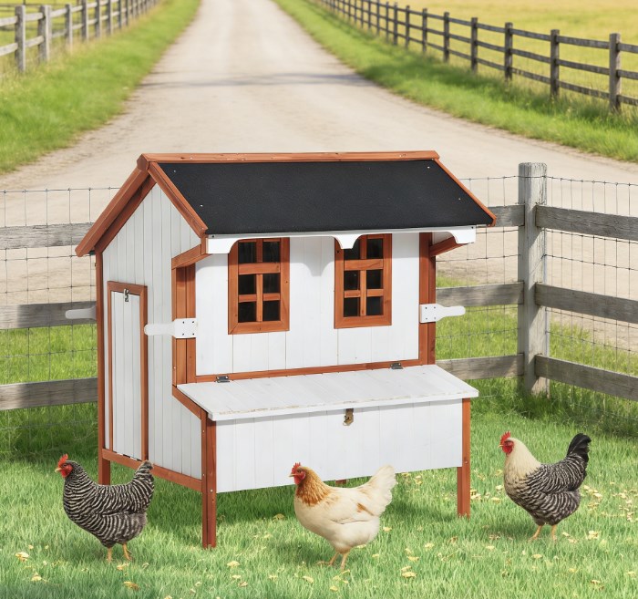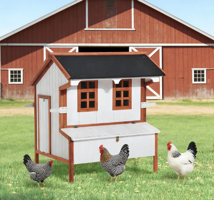 • - COMPACT CHICKEN COOP: Charming compact and easy to install in a backyard or side yard, this coop can hold 3-5 chickens comfortably with a dedicated space for roosting and egg laying in the chicken nesting box. A large side door doubles as an entry/exit ramp to allow the chickens to wander the yard.