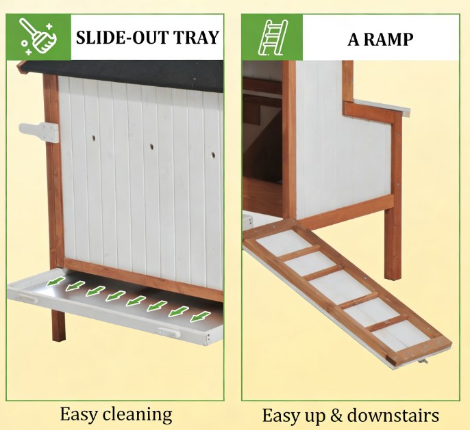 • - EASY ACCESS TO LIVING SPACE: Cage includes an opening roof for access when cleaning or collecting eggs. Glass windows also allow you to see inside when the coop is closed up. A sliding pan conveniently removes from the bottom for quick and easy cleaning.
