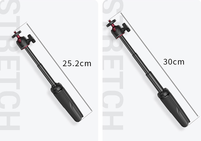 Tripod: storage size 160mm; phone clip: 75 X 35 X 25mm; microphone: 20 X 20 X 69.2mm; fill light: 72 X 89 X 31.6mm; magic hand: 144X 18 X 25mm