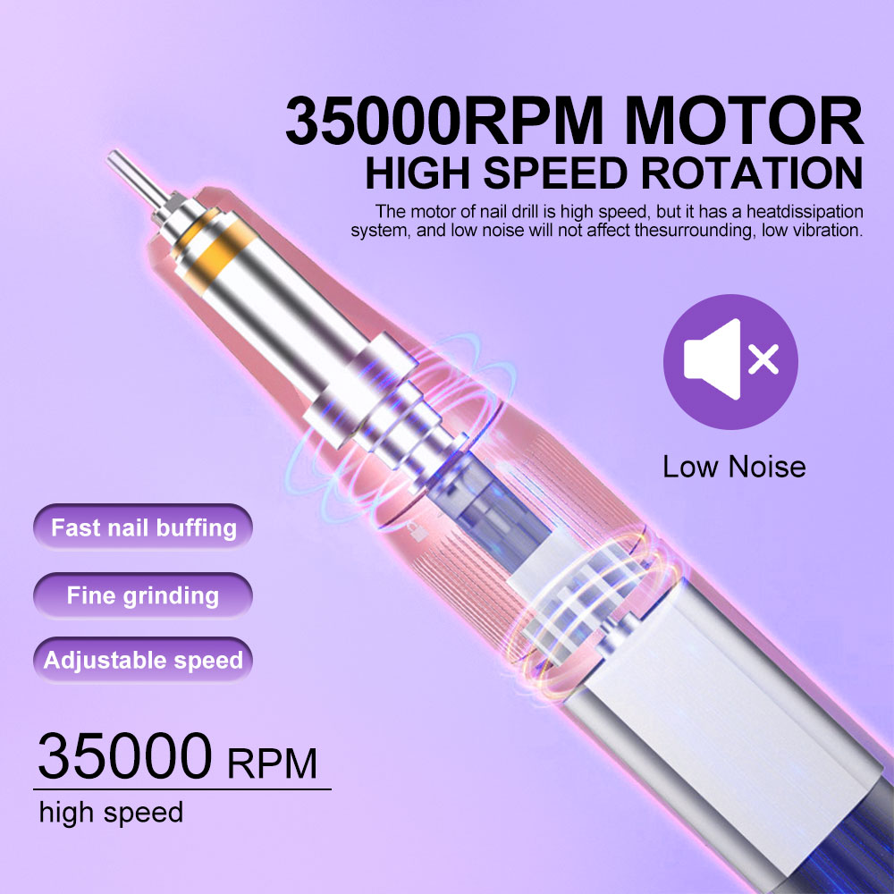 【High Speed Up to 35000RPM】Our acrylic nail drill equipped with an updated high-quality motor, higher stability, and long life. Even at a high speed (0-35000RPM) this electric nail file works smoothly and extremely. Easy to use, smooth rotation, professional technician or DIY novice, it is the most suitable file.