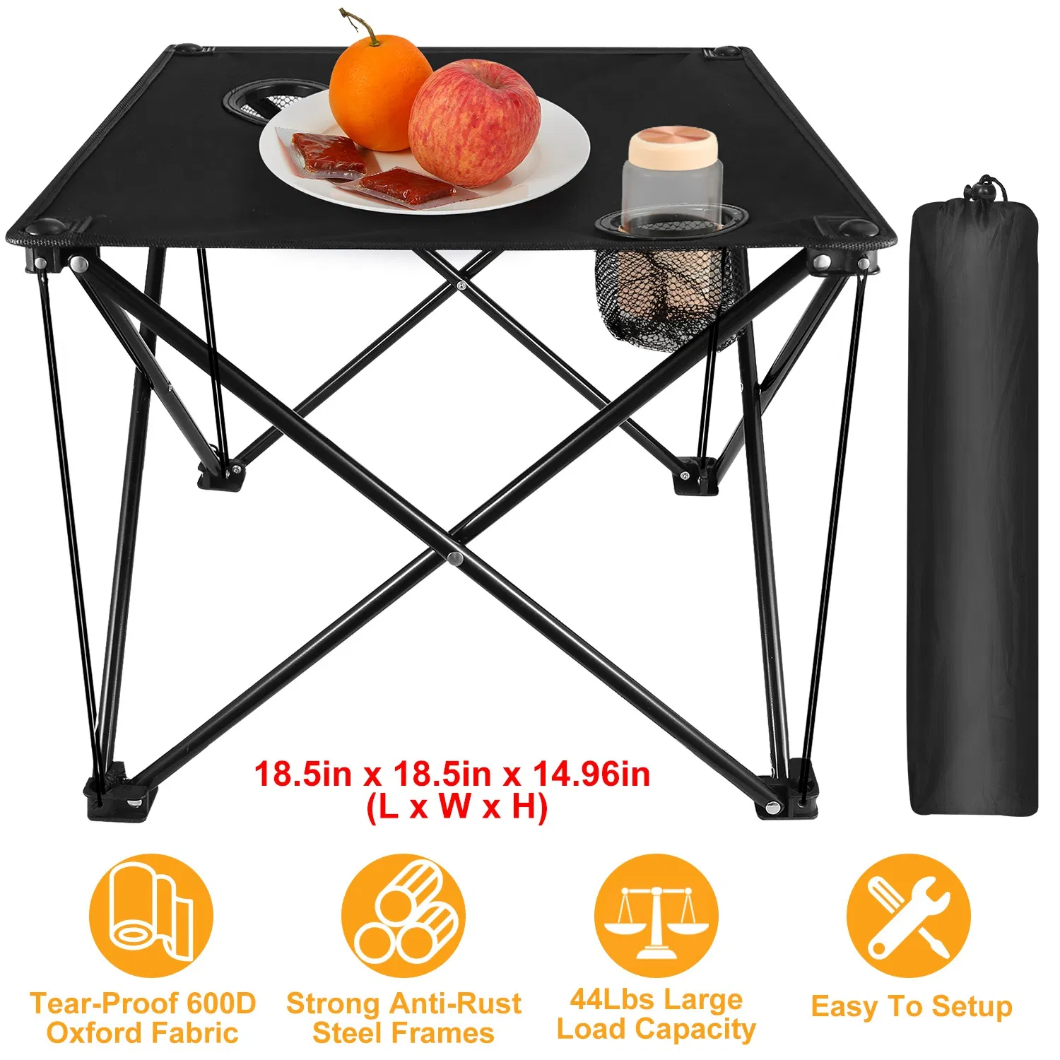 *PORTABLE FOLDING TABLE: Adopting foldable design, our 18.5in x 18.5in x 14.96in (L x W x H) square table can be folded to a compact (22.44in x 5.51in) storage bag. And this only 2.04 pounds’ lightweight table will not slow down the forward speed and go everywhere with it.