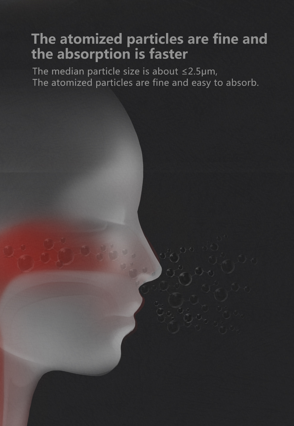 2. Fine particles: large fog, fine atomized particles, median particle size of about ≤ 2.5μm, more adequate drug absorption