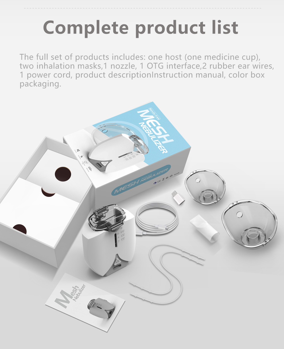 6. Atomization mode: According to different situations, you can choose two atomization methods, namely mask atomization (divided into adult and child masks) and mouthpiece atomization