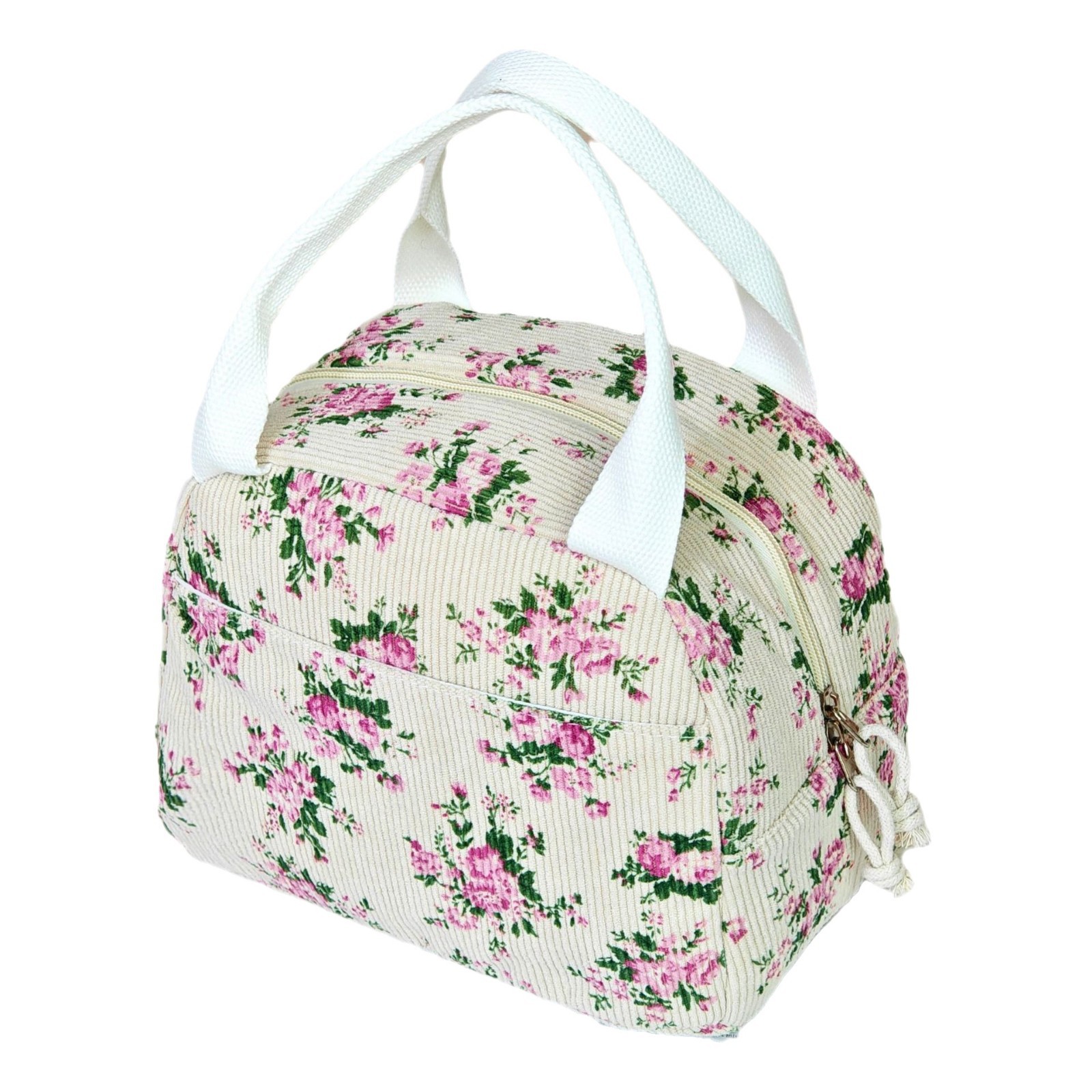 Color: white background with blue print, pink bow, small cherry, little bee, pink flower