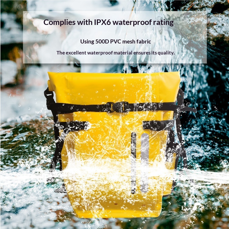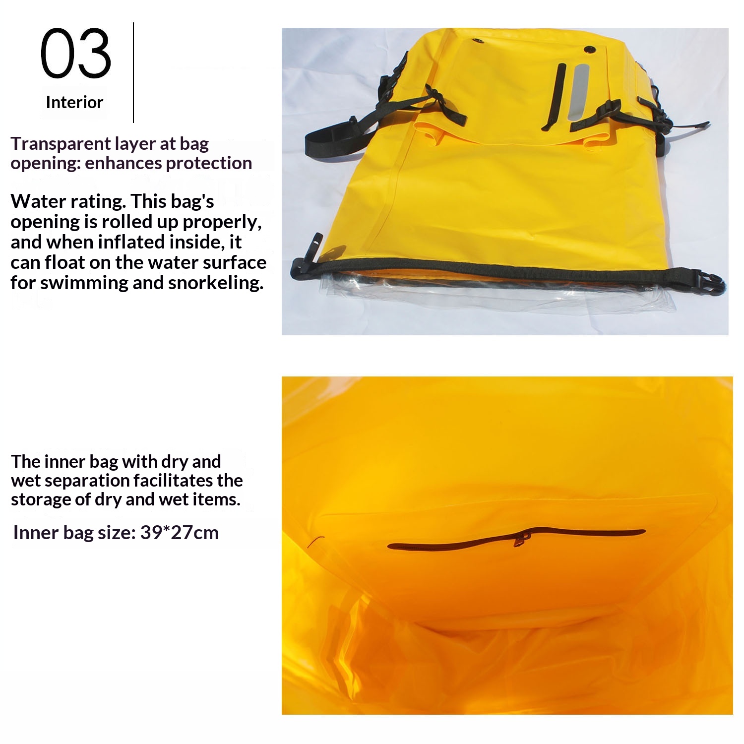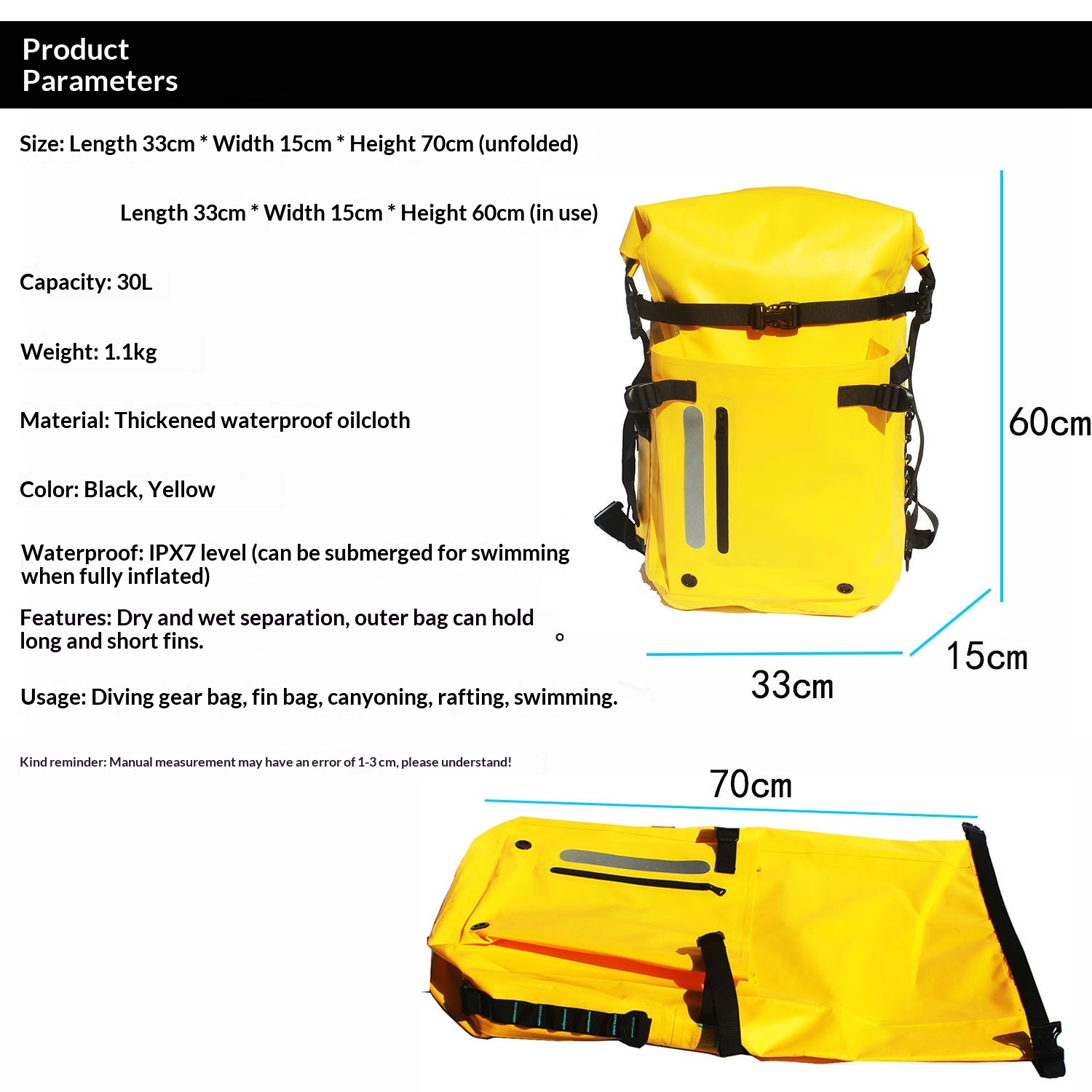 Product information:Color: Yellow, Black Does it have a liner? No Material: 500D PVC Size: 30 Capacity: 30 liters