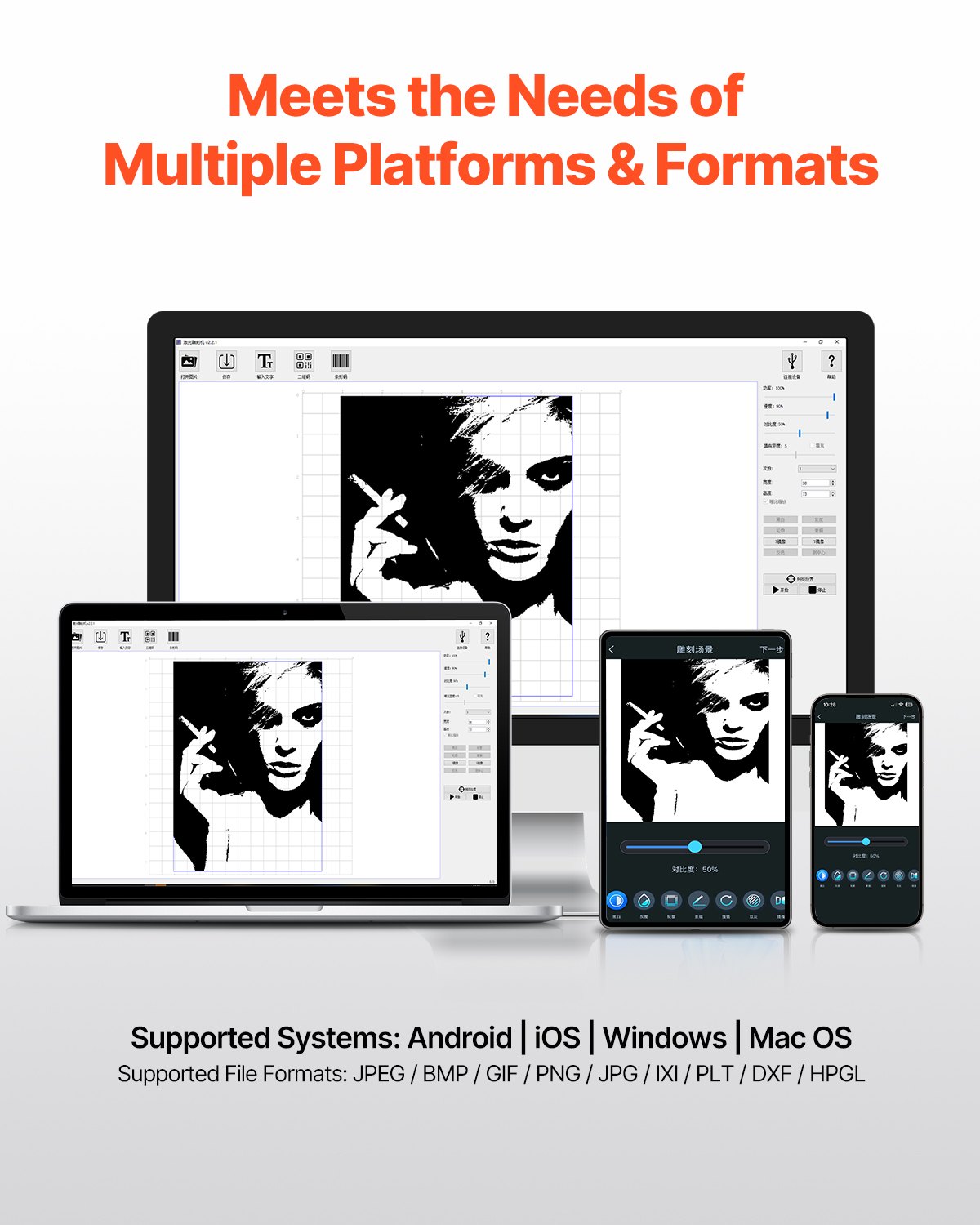 Wide System Support: This portable engraving machine works with Android, iOS, Windows, and Mac OS. It supports various file formats, including JPEG, BMP, GIF, PNG, JPG, PLT, DXF, and HPGL, keeping flexibility for different users.