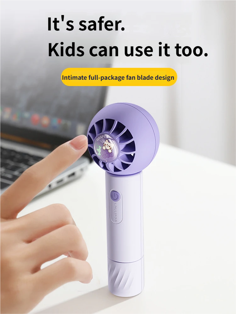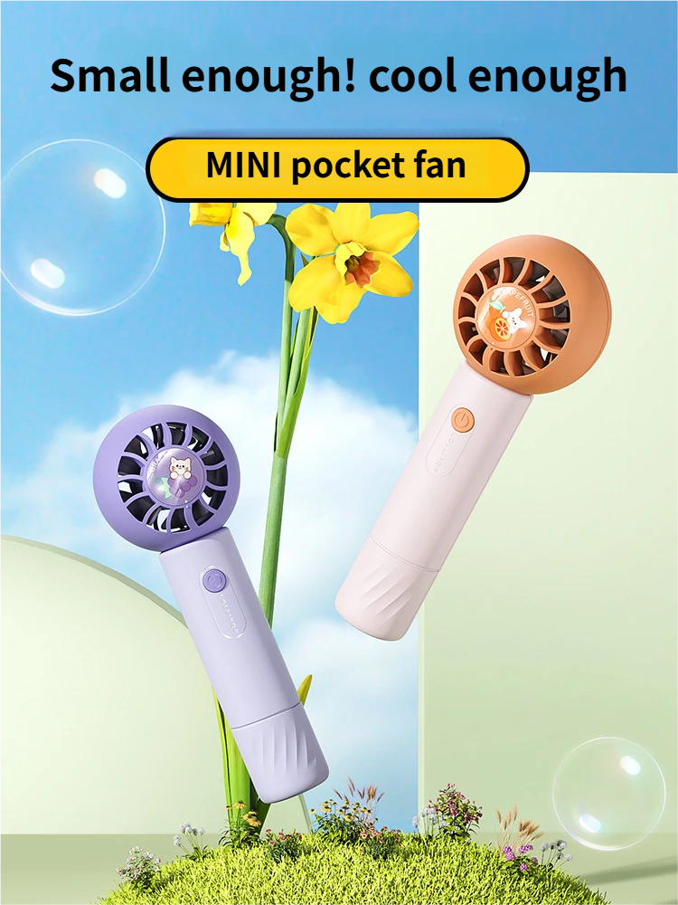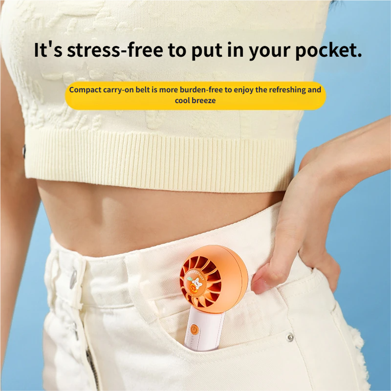 This portable mini fan in orange and purple is a compact cooling companion for personal use, designed with a mechanical operation and 3 adjustable wind speeds to deliver natural wind for customized cooling. Equipped with a built-in 800-1000mAh rechargeable battery and USB power supply, it offers 3-6 hours of long-lasting time,supporting both battery and direct USB charging for versatile use. With ultra-low noise (≤36dB (A)), a tiny size of 74*65*50mm and light weight of 96g, it’s perfect for personal use within 10㎡ space, ideal for desk, travel, outdoor and daily on-the-go cooling needs.
