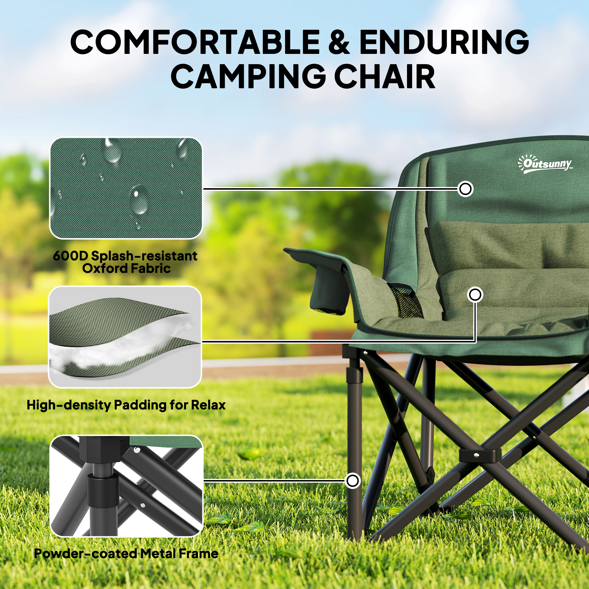 This camping chair gives comfort to outdoor times, wherever you go. With the high density padding in the head, back, arms and seat, you'll sink in comfortably. A metal frame for a strong, supportive core, with the splash-resistant fabric seat for durability. Complete with two cup holders and side pockets. When done, all you need to do is fold it up and fit inside the included carry bag.