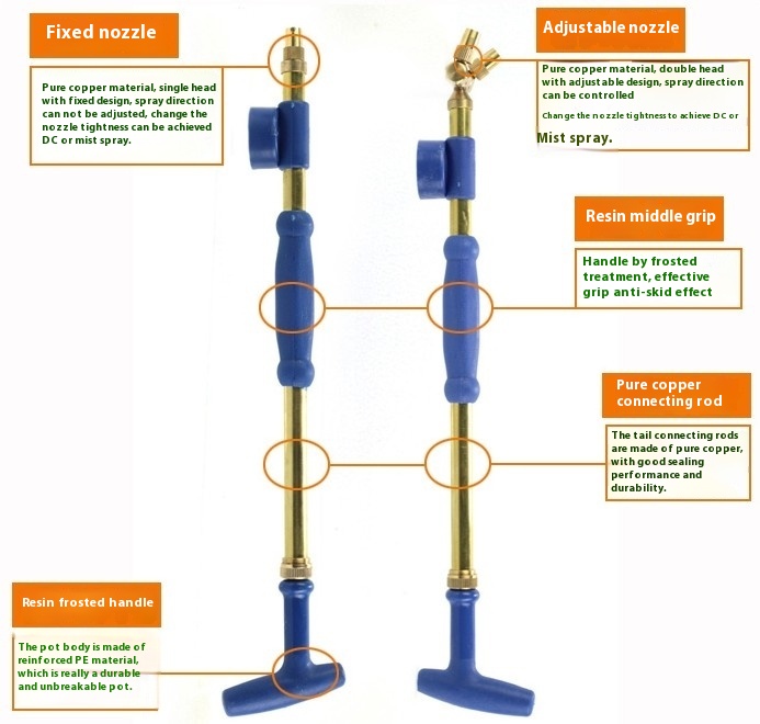 Product description: Luxury and practical. By adjusting the rotating copper nozzle, the size of the water droplets sprayed can be controlled. When watering, the nozzle can be loosened and the water droplets can be larger; When spray or spraying, the nozzle should be tightened and the water sprayed out should be in the form of mist
