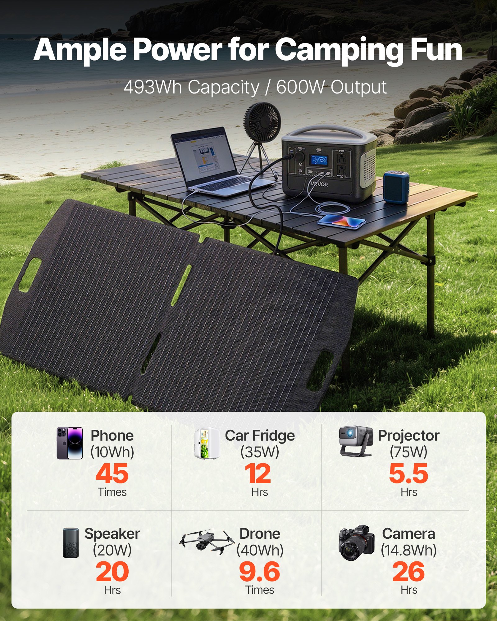 Reliable Portable Power: Enjoy a stable power supply for home backup or outdoor adventures with this 600W 493Wh portable power station. It can simultaneously power mobile phones, car refrigerators, speakers, and cameras during camping for about 6 hours