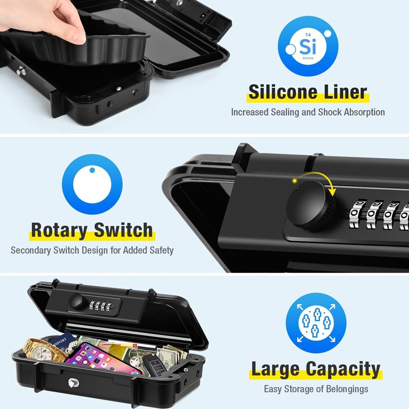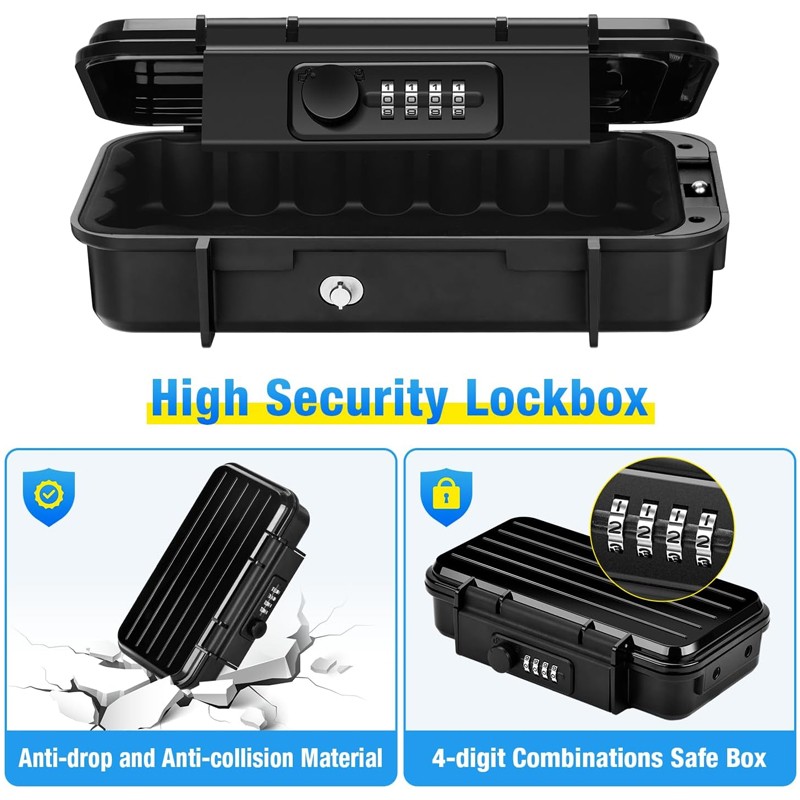 -The combination lock consists of a 4-digit code, with up to 10,000 possible combinations. (Note: it is best to take a photo and record it after resetting the code, otherwise you will not be able to open the combination safe again.)