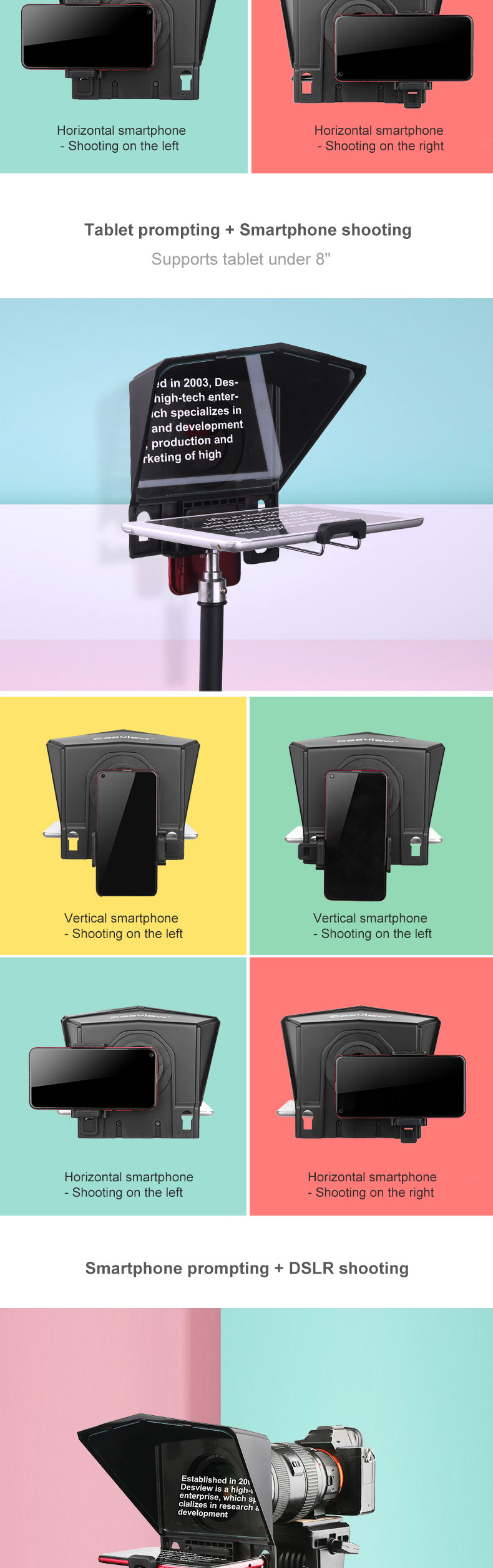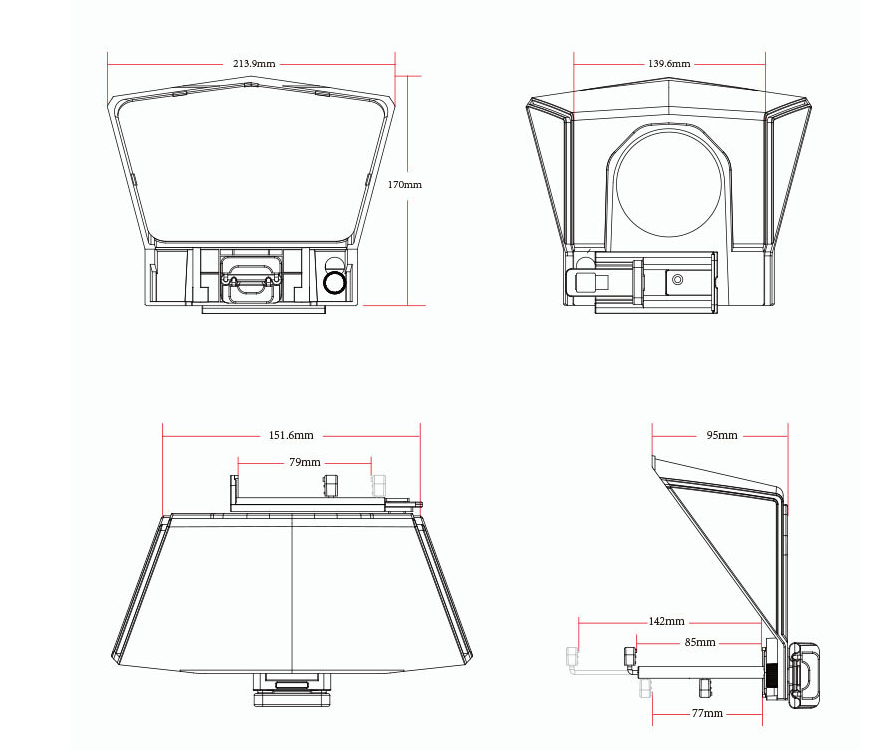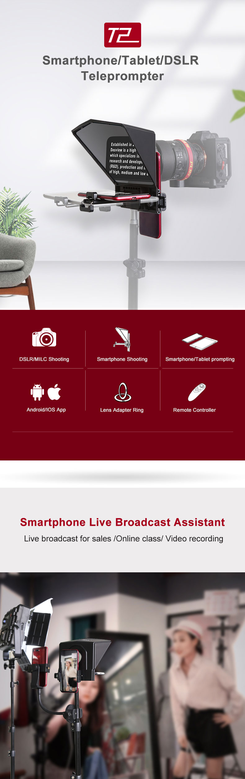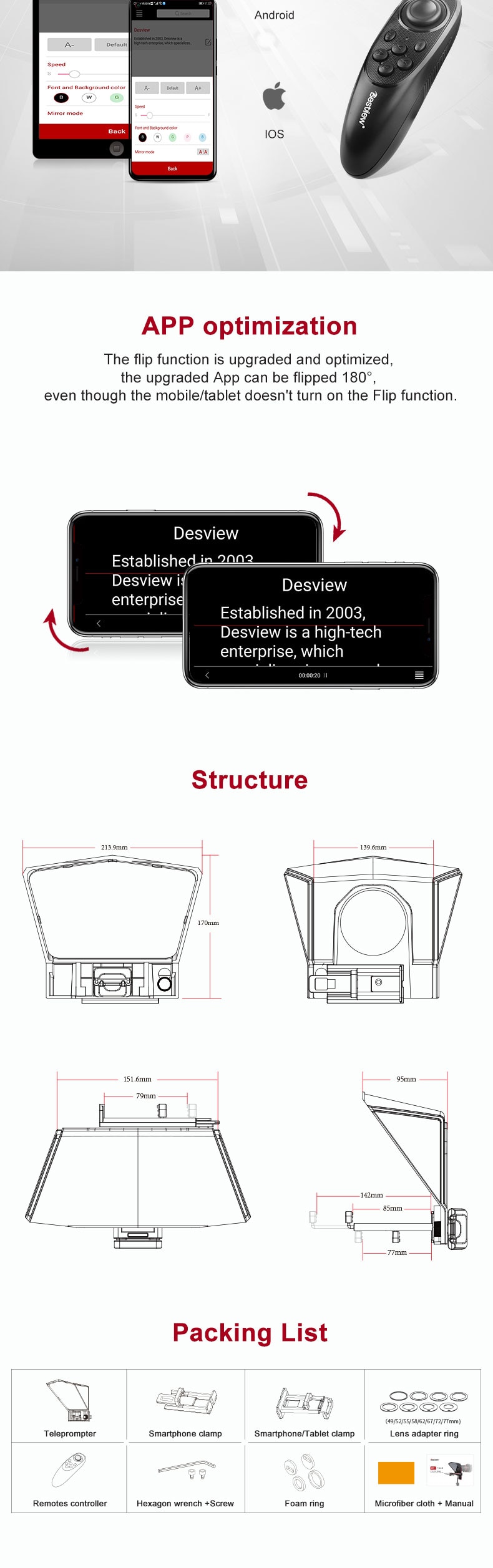 Packing list: teleprompter, mobile phone holder, mobile phone/tablet holder, adapter ring, remote control, hexagon wrench + screws, foam ring, dust cloth + manual