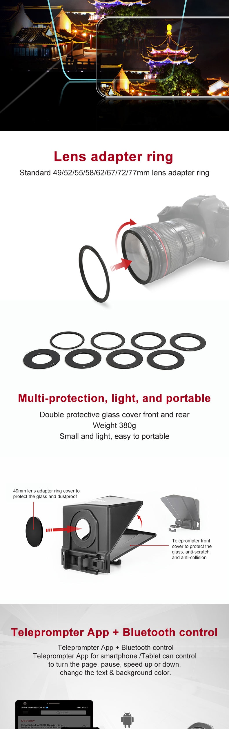 Adapter ring size: 49mm/52mm/55mm/58mm/62mm/67 mm/ 72mm/77mm