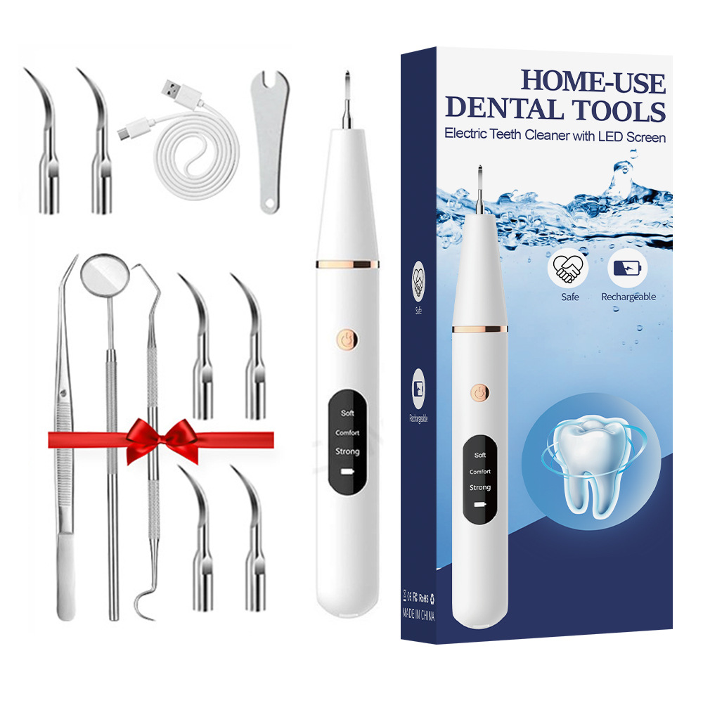 Dental cleaner host *1, sanding head *1, flat head *1, oral mirror *1, toothbrush head *3, charging cable *1, English instruction *1, English color box *1