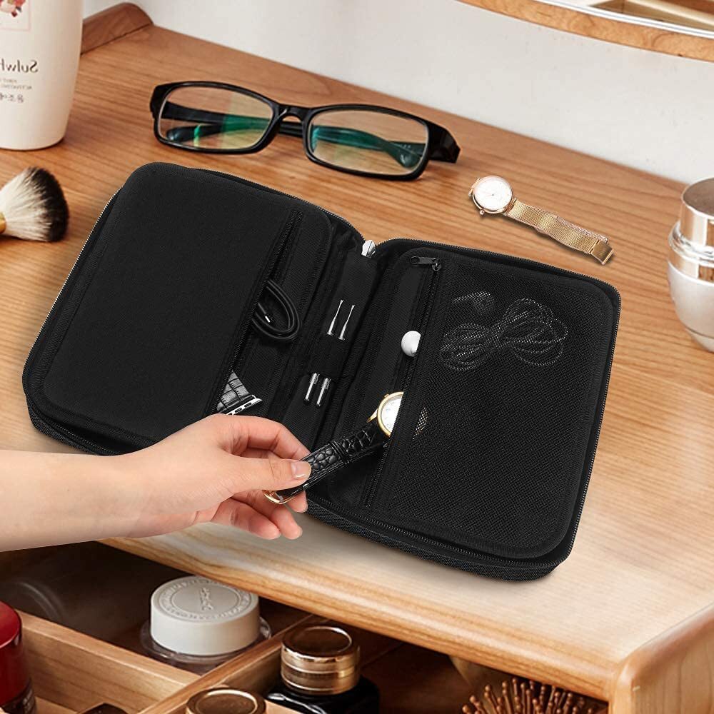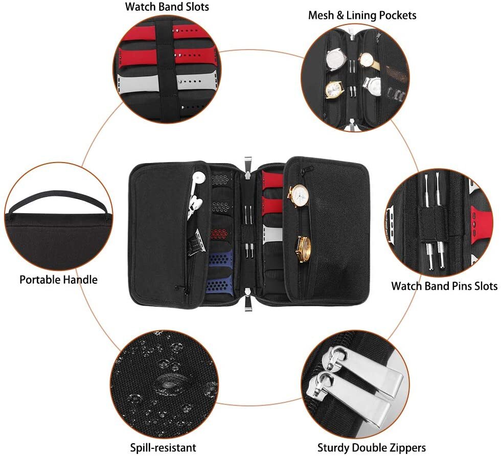 Premium Material- Watch band storage bag is made of spill-resistant nylon surface which can protect your items from wear and water. The thick sponge layer on both sides to prevent scratches and external crushing damage to your watch straps.