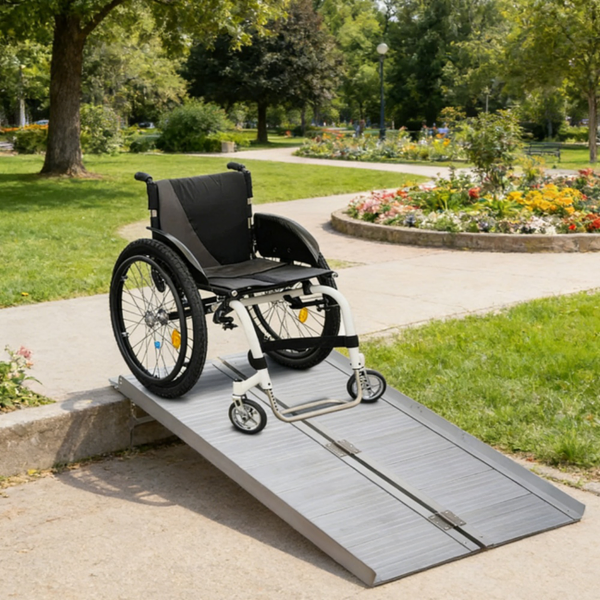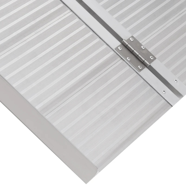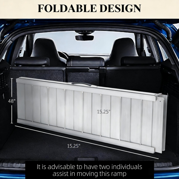 Features: - Sturdy, anti-corrosive aluminum alloy construction with ultra-strong, high load-bearing durability, allowing up to 600 lbs. - Suitable for wheelchairs, scooters, and bicycles - Skidproof ribbed surface to prevent sliding in any weather - Comes with two high sides to prevent accidental falls - Folds up when not in use and features a handle for carrying, allowing easy transportation and quick storage - Make sure to measure the rise of your application and pick the proper ramp length based on your height of use Specification: - Color: Silver - Material: Aluminum - Weight Capacity: 600 lbs. - Unfolded Dimensions: 48" L x 29.1" W x 2" H - Folded Dimensions: 48" L x 15.4" W x 3.5" H - Ramp Length: 4 ft. - Net Weight: 24 lbs.