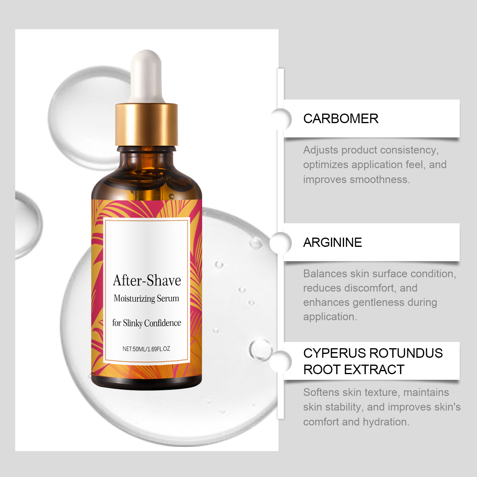 Product information:Ingredients: water, glycerin, 1,2- hexanediol, carbomer, arginine, Cyperus rotundus root extract.