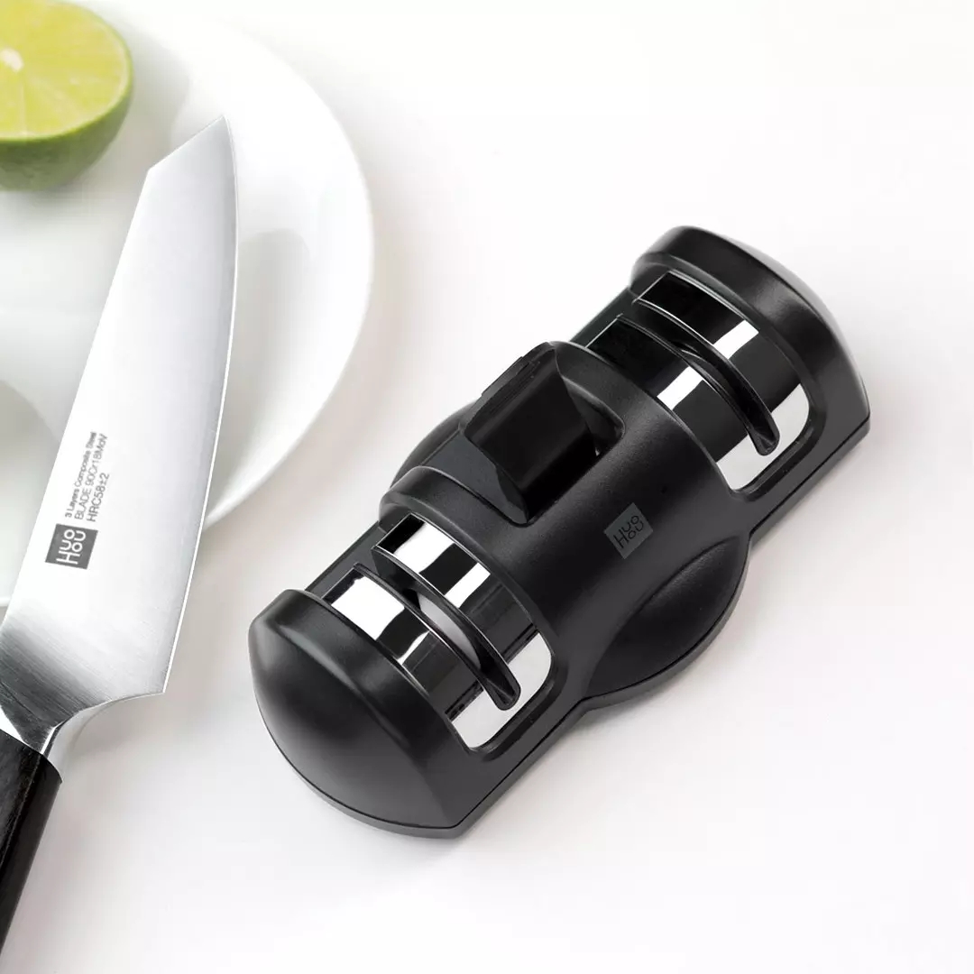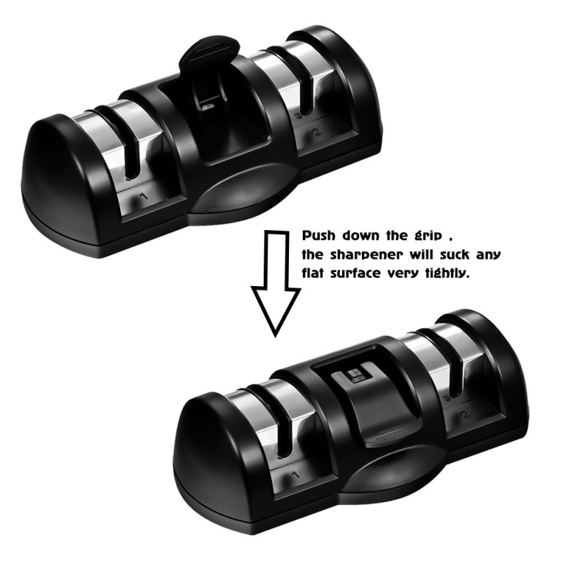 1. Place the knife sharpener on a flat surface and hold the sharpener handle with one hand, hold the knife holder with the other