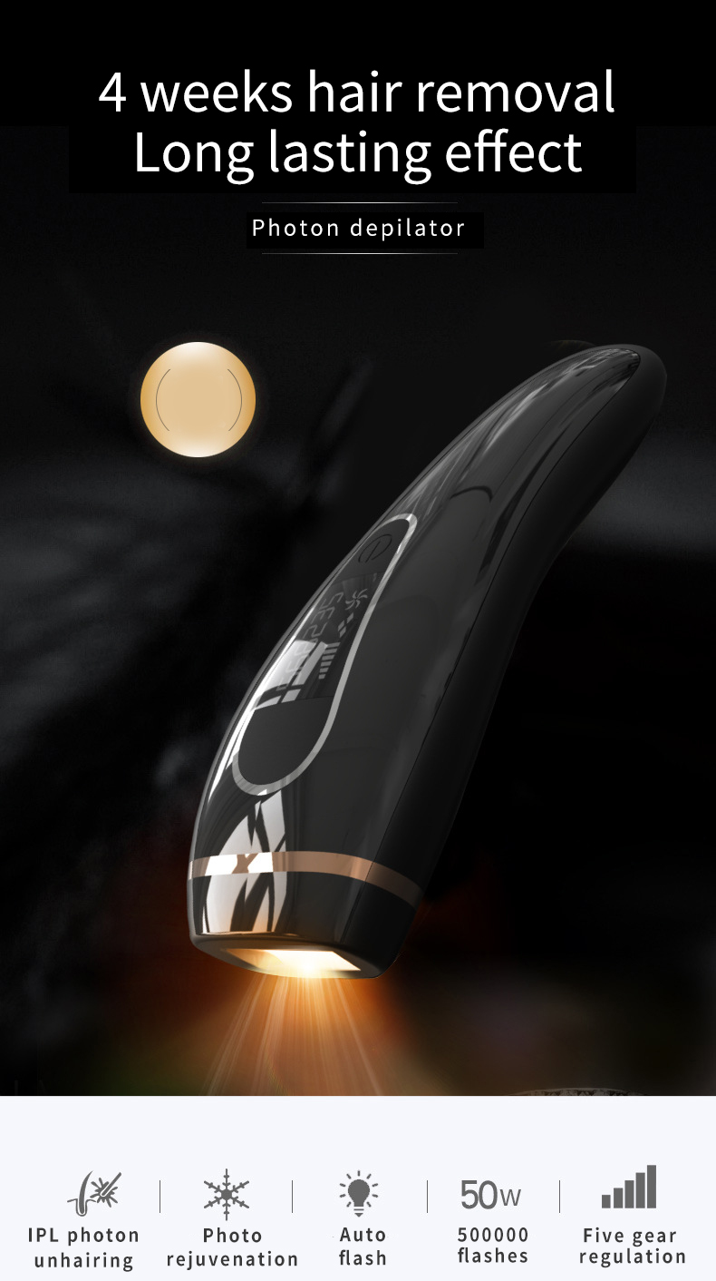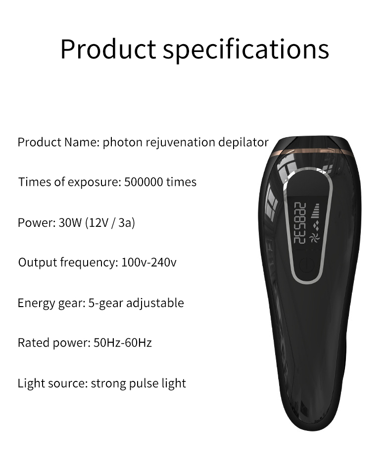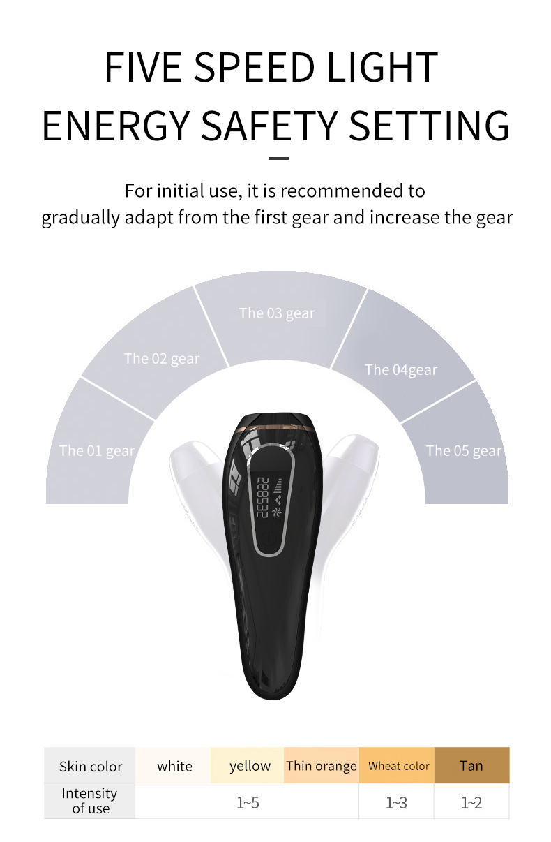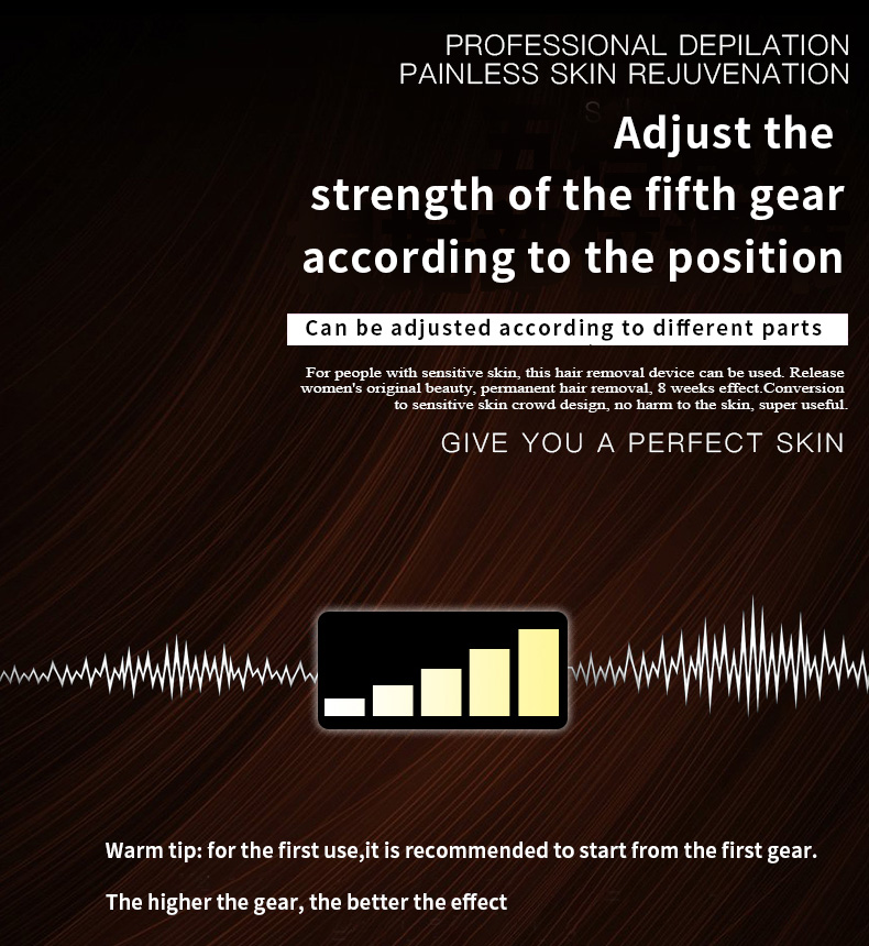 3.Five Energy Regulation Design -8files switching stall interval is only 3 seconds, hair removal efficiency is increased by 30%.Free adjust the intensity of light, effective against different skin color and hair color(Dark brown skin and black skin are not applicable). Gentle IPL light irradiation, even if the extremely sensitive parts, but also can have hair removal.