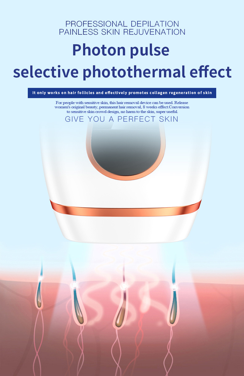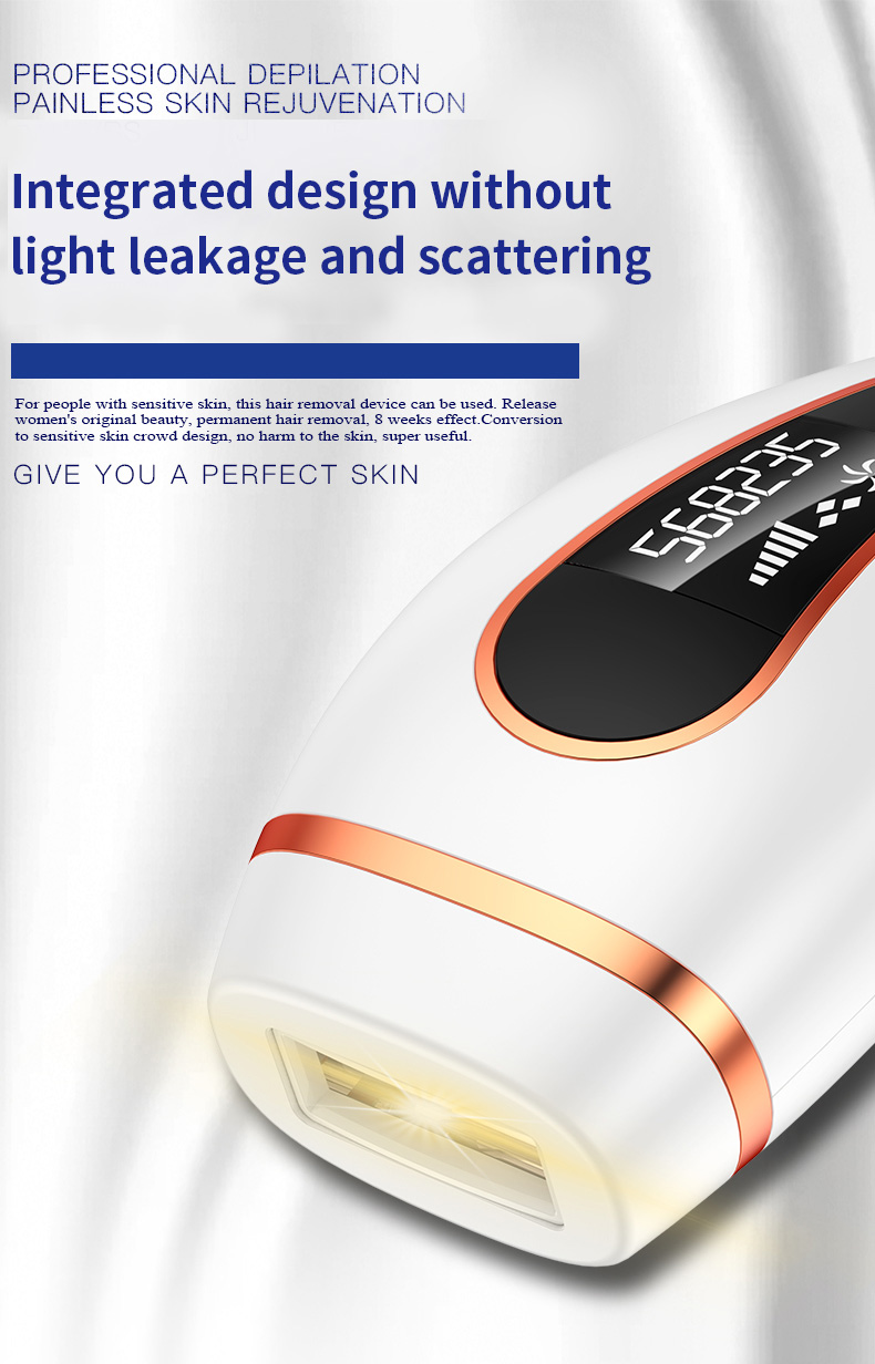 2.IPL Technology-Due to its built-in intense pulsed light technology, the IPL Hair Removal Device is effective and painless. The IPL light is absorbed by the melanin in the hair follicle below the skin and can suppress hair growth.No stimulation, no damage, long-lasting and gentle inhibition of hair regrowth, providing you with a new experience of efficient and comfortable hair removal.