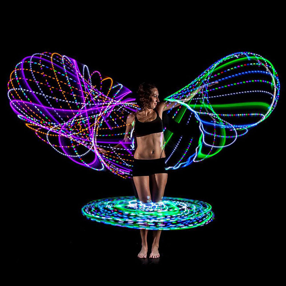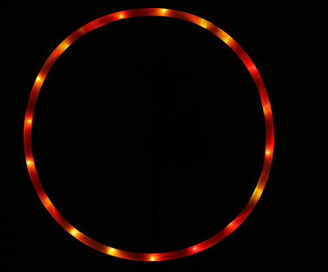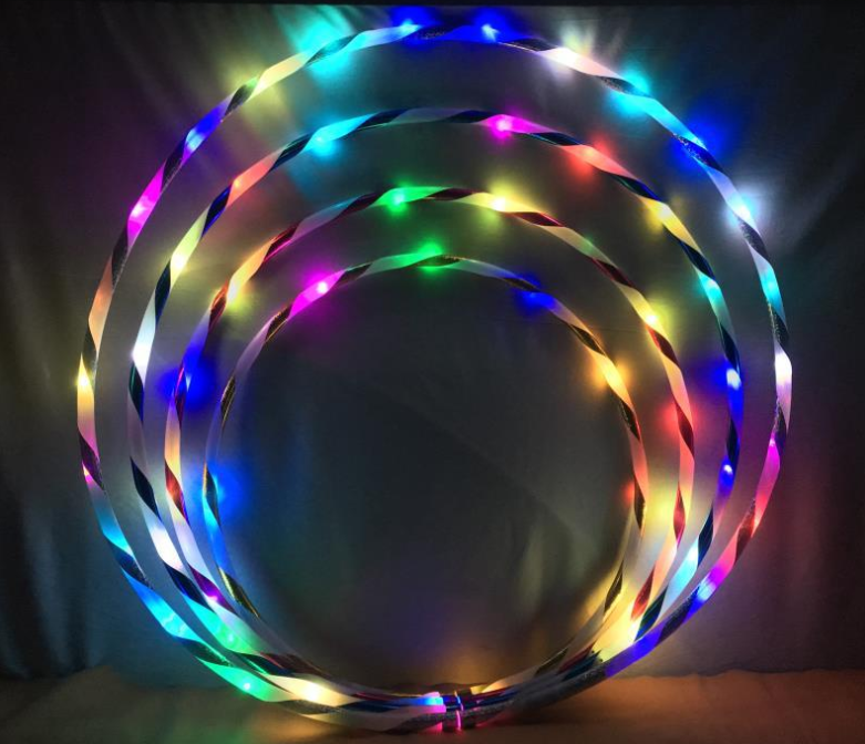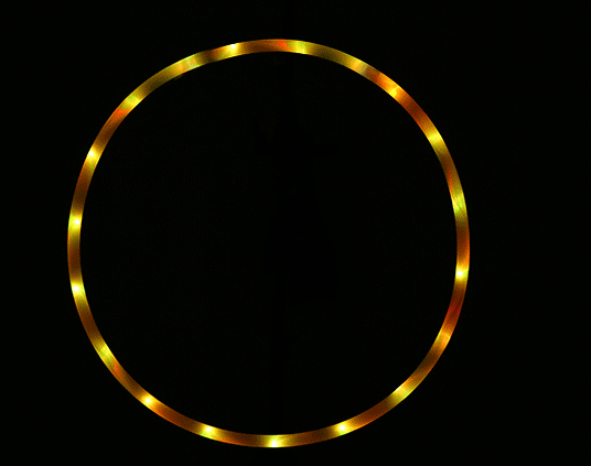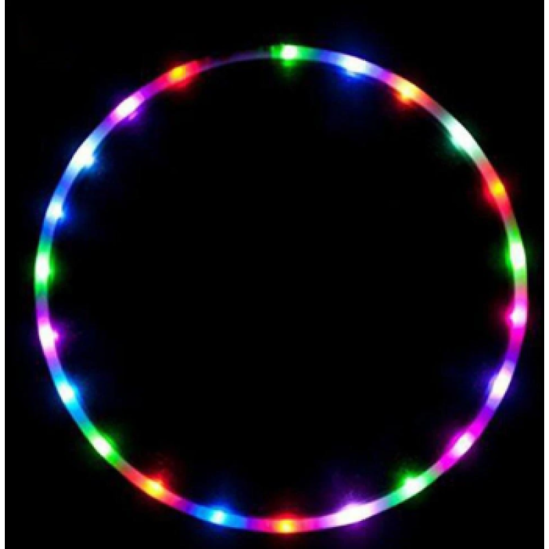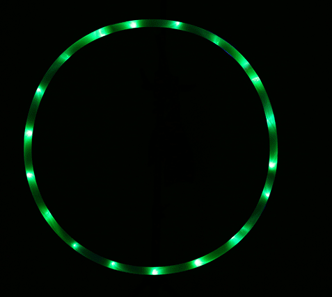 A light-emitting hoop includes a ring body, a connector, a power source and an LED light-emitting tube. The ring body is curled into a ring shape from a long tube. Inside the ring body and the switch is exposed through the opening, there are several LED light-emitting tubes, which are distributed in the ring body and connected to the power source through a wire.