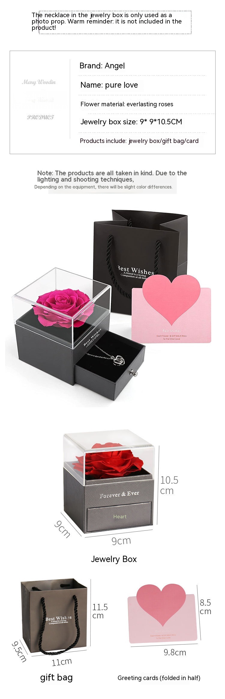 Product information:Flower Material: Eternal RoseJewelry box size: 9 * 9 * 10.5cmProduct includes: jewelry box/gift bag/card