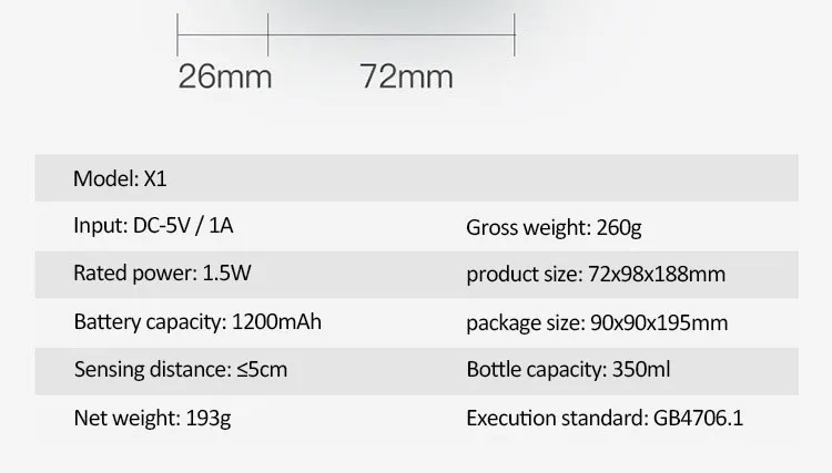 Input: DC-5V / 1ARated power: 1.5WProduct size: 72x98x1 88mmBattery capacity: 1200mAhInduction distance: ≤5cmBottle capacity: 350ml