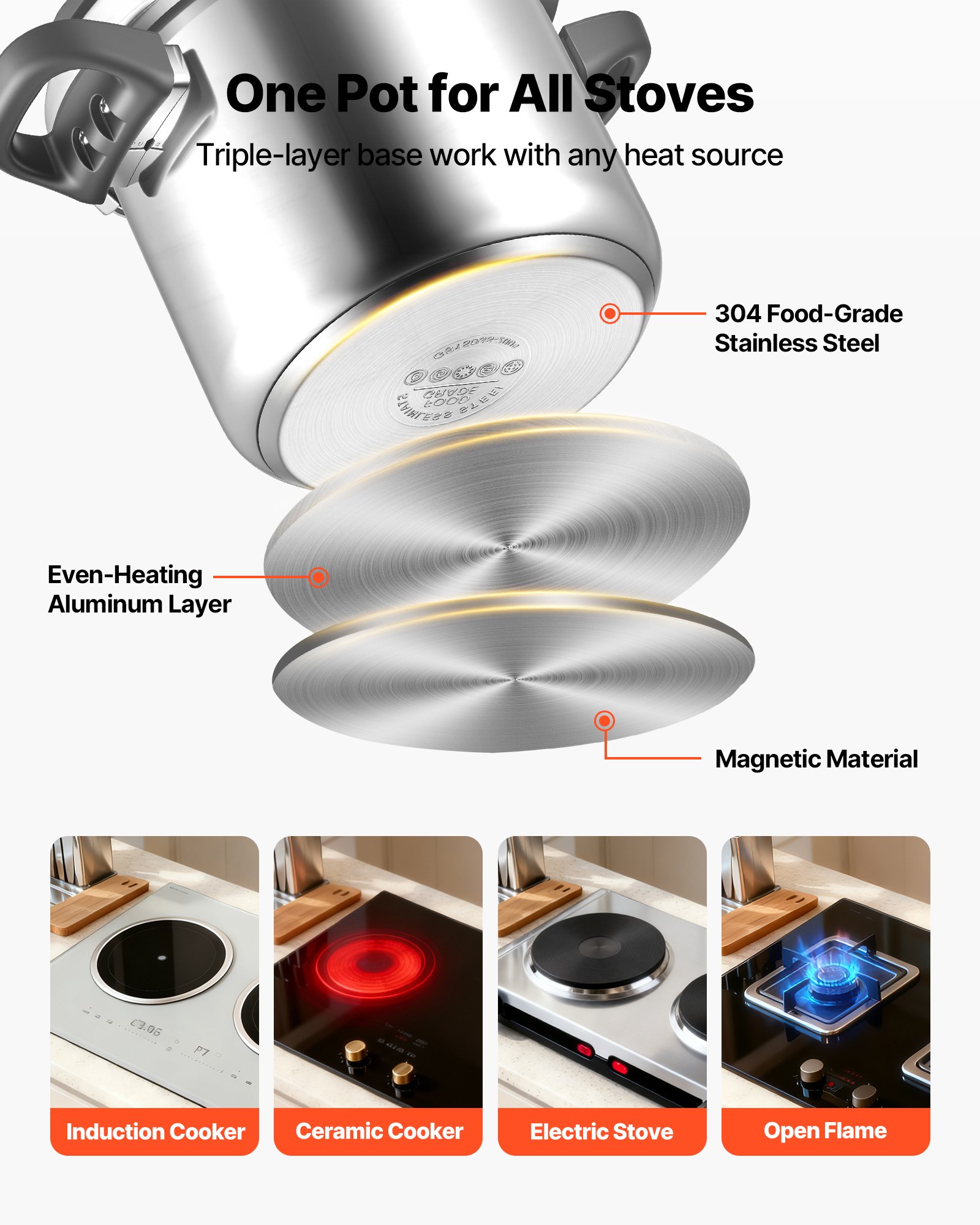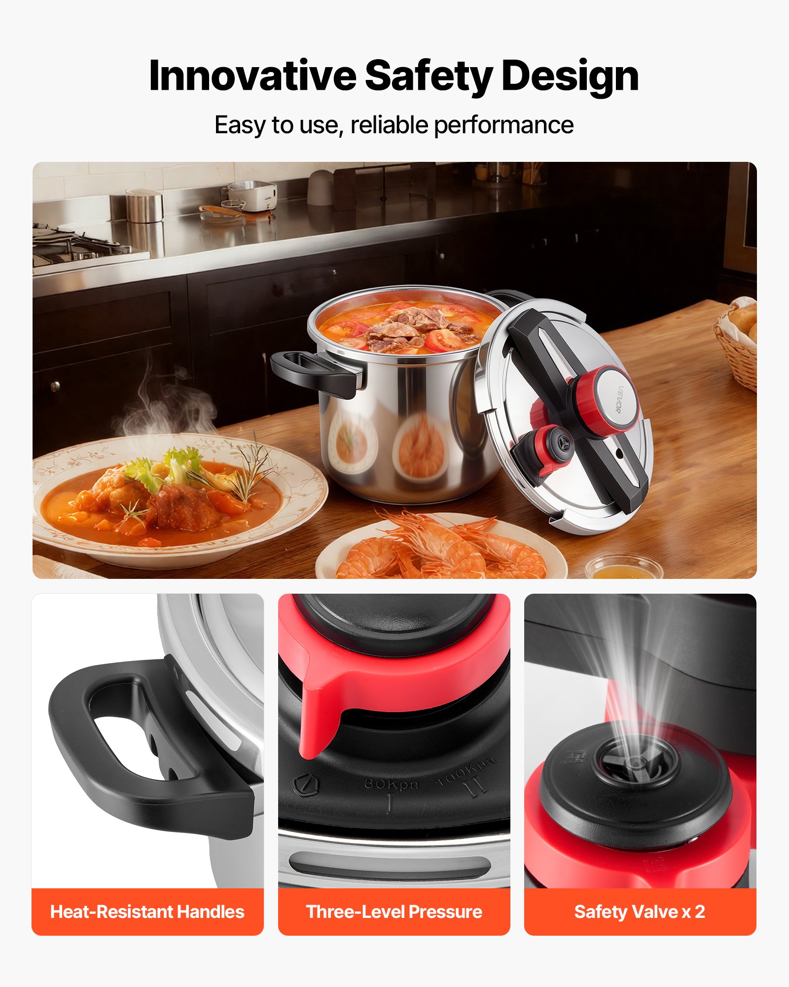 Even-Heat Structure: A triple-layer bottom lets the pressure cooker heat rapidly and evenly on induction, ceramic, electric, or gas stovetops. It fits varied cooking setups without limitation and supports energy savings of up to 75% while keeping mealtime flexible and efficient