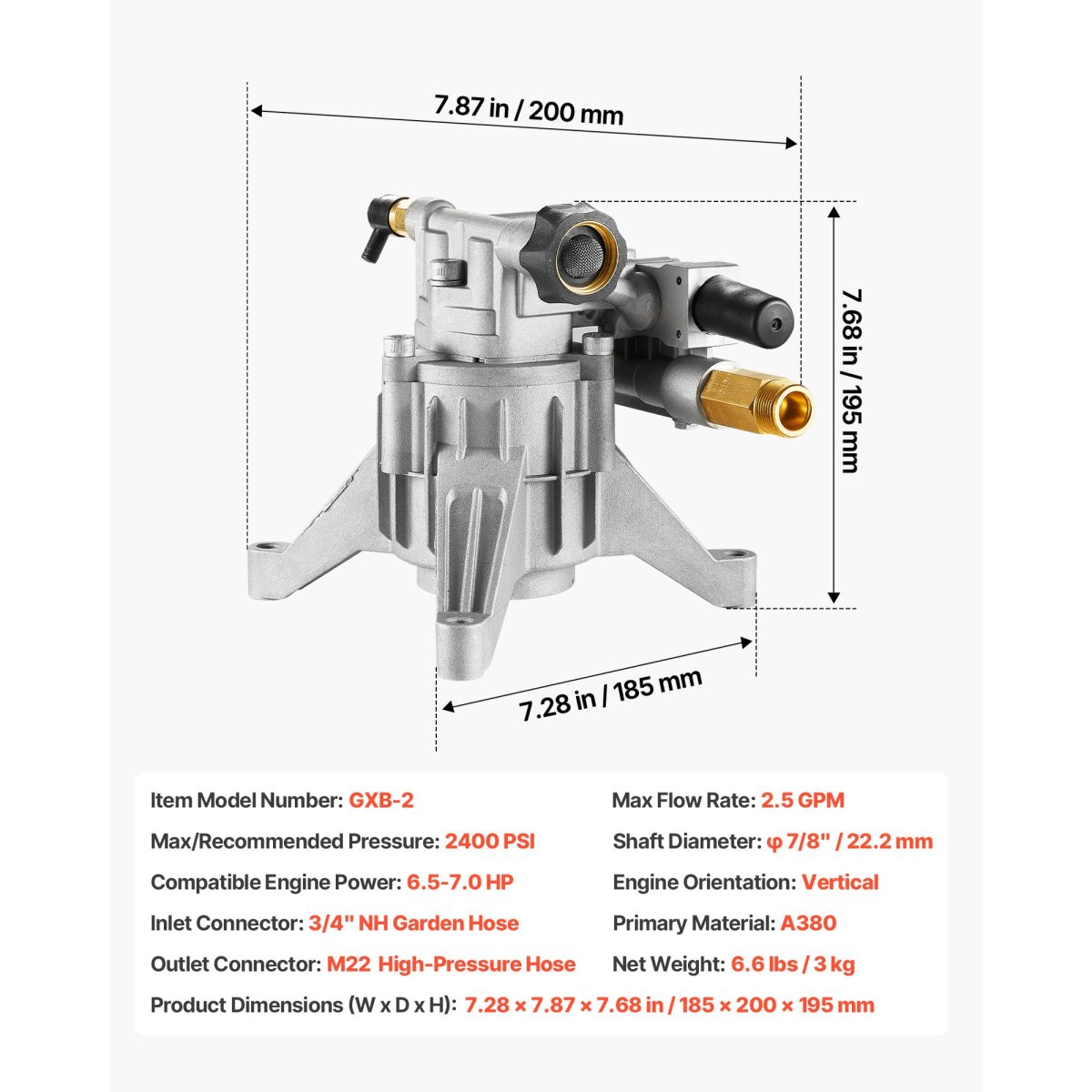Strong Compatibility: Designed for 7/8-inch vertical shaft rear-outlet engines, this power washer pump fits most 6.5-7.0HP engines with a standard SAE bolt pattern, making pump replacements easy and efficient
