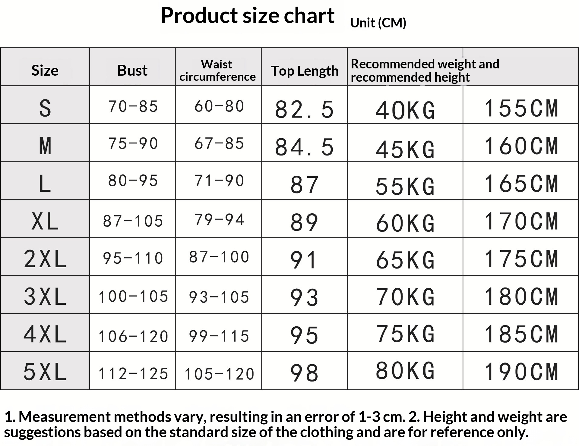 Sizes: S, M, L, XL, XXL, XXXL, 4XL, 5XL