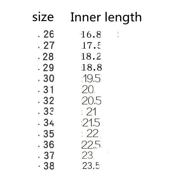 Size: size 26/16.8cm, size 27/17.5cm, size 28/18.2cm, size 29/18.8cm, size 30/19.5cm, size 31/20cm, size 32/20.5cm, size 33/21cm, size 34 /21.5cm, size 35/22cm, size 36/22.5cm, size 37/23cm, size 38/23.5cm