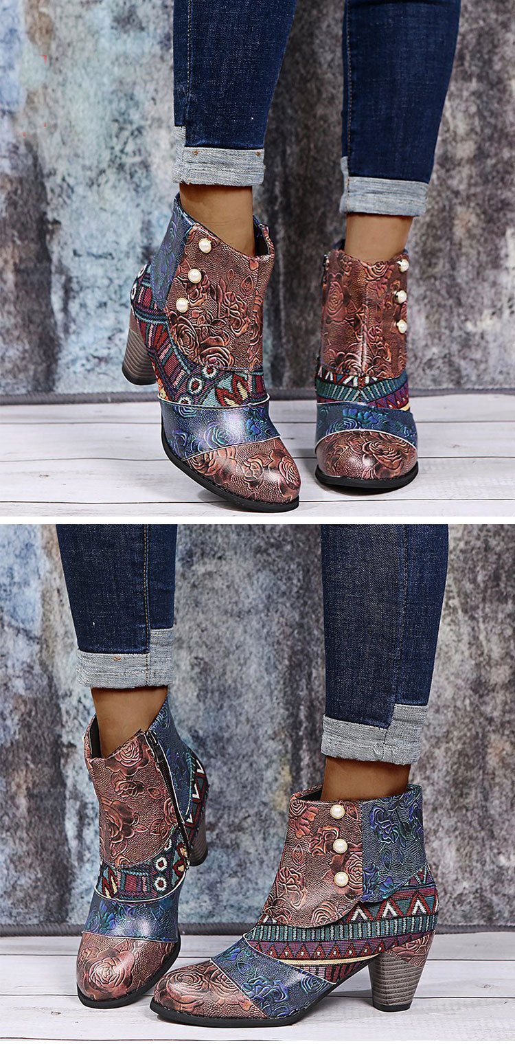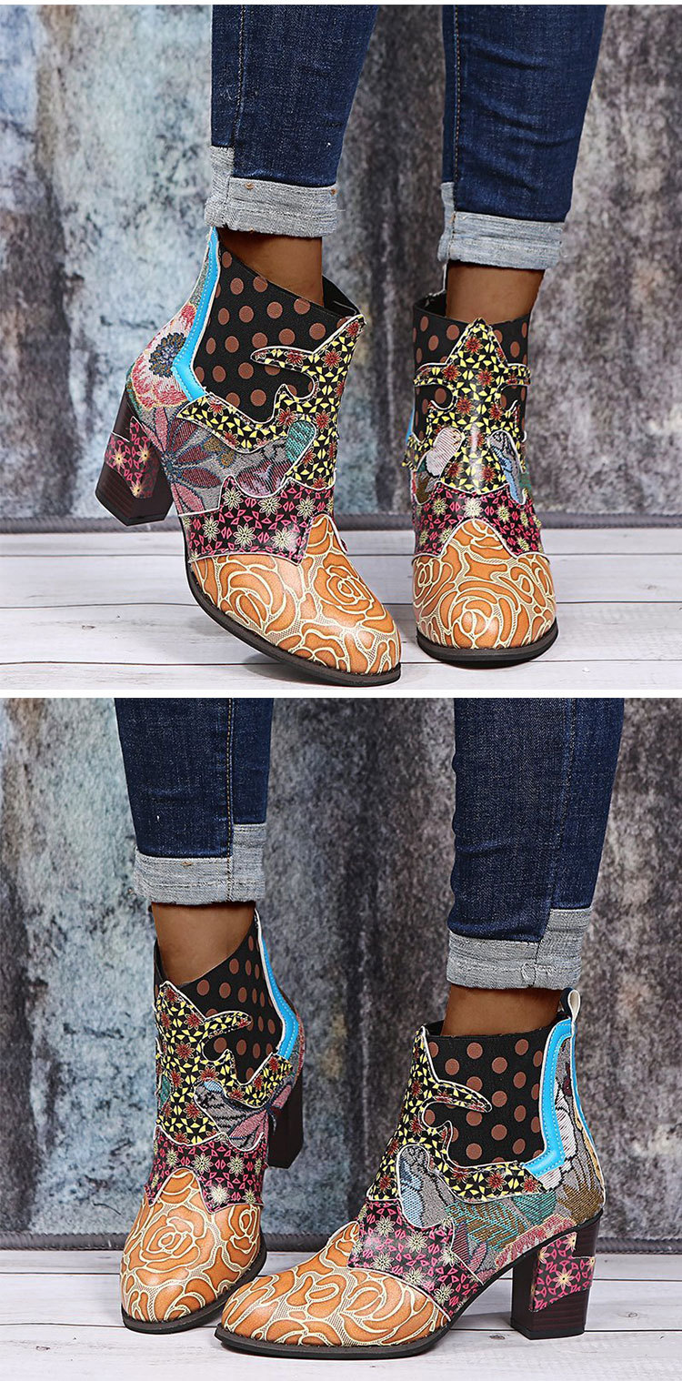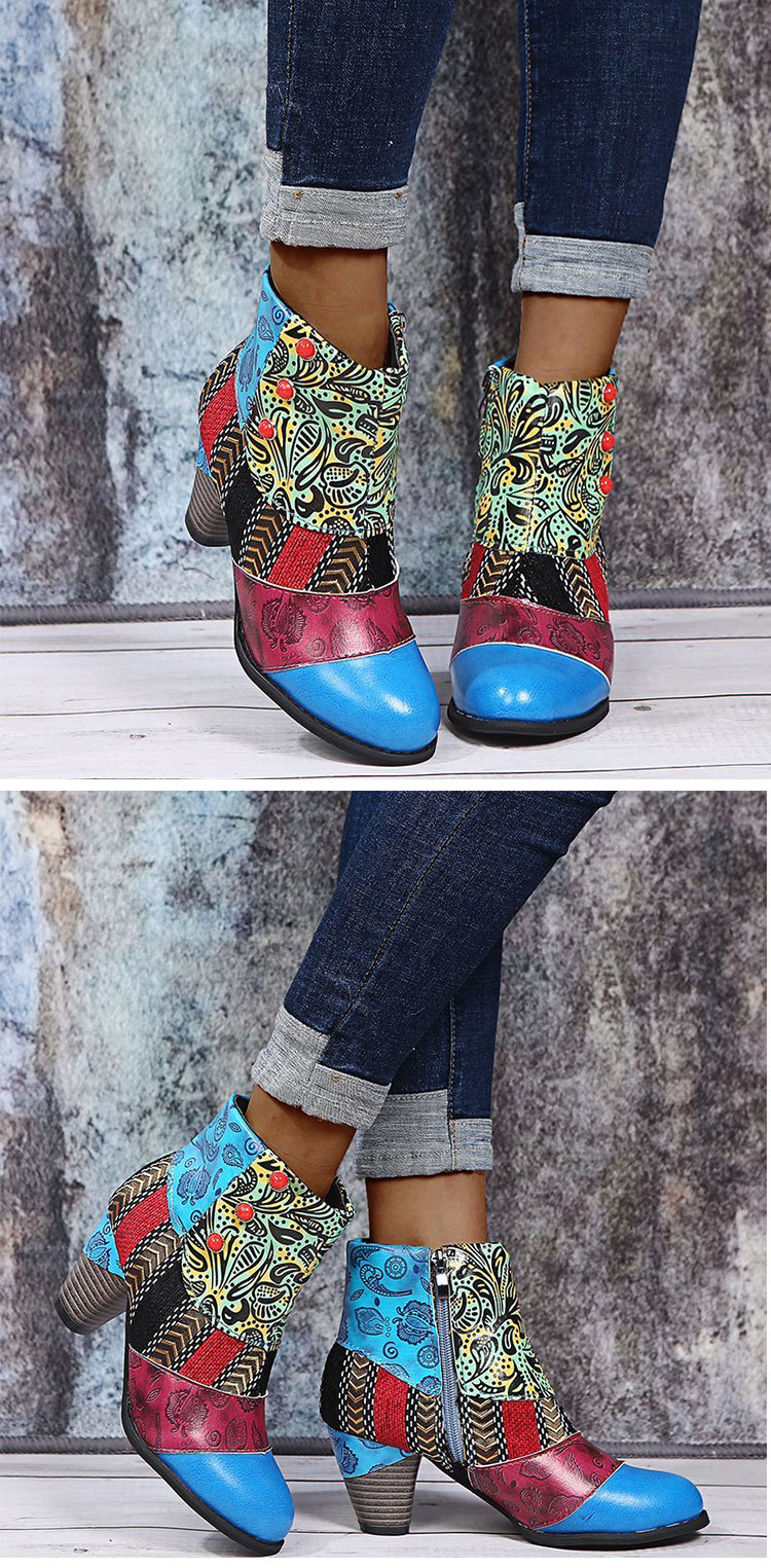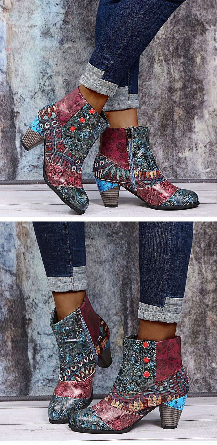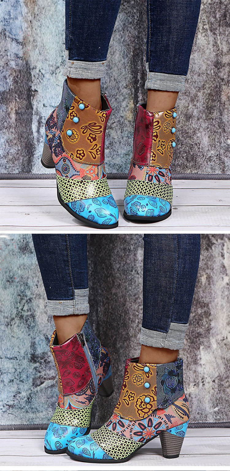 Print Ankle Boots Chunky Mid Heel Boots Women Side Zipper Shoes