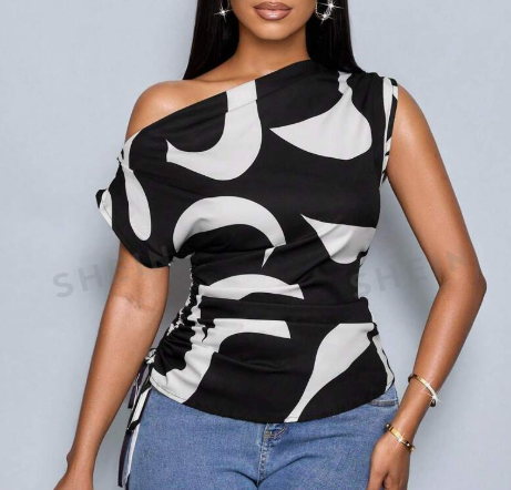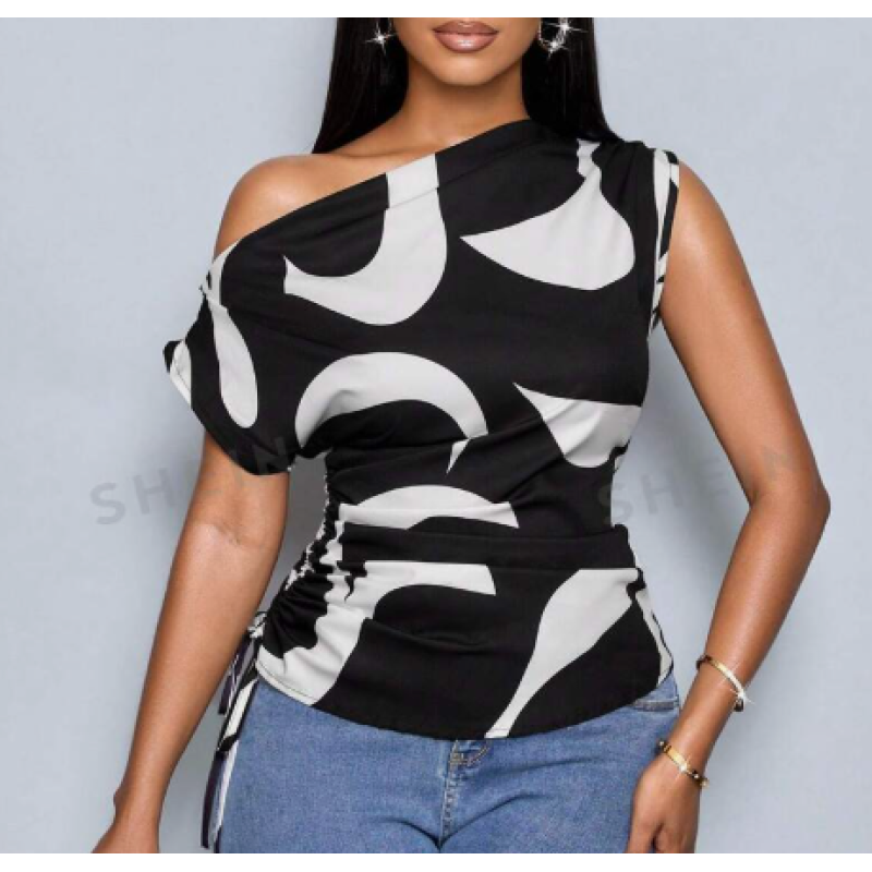 Print Asymmetric Collar Side Drawstring Shirt With Random Printing One Shoulder Top