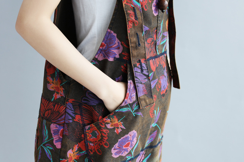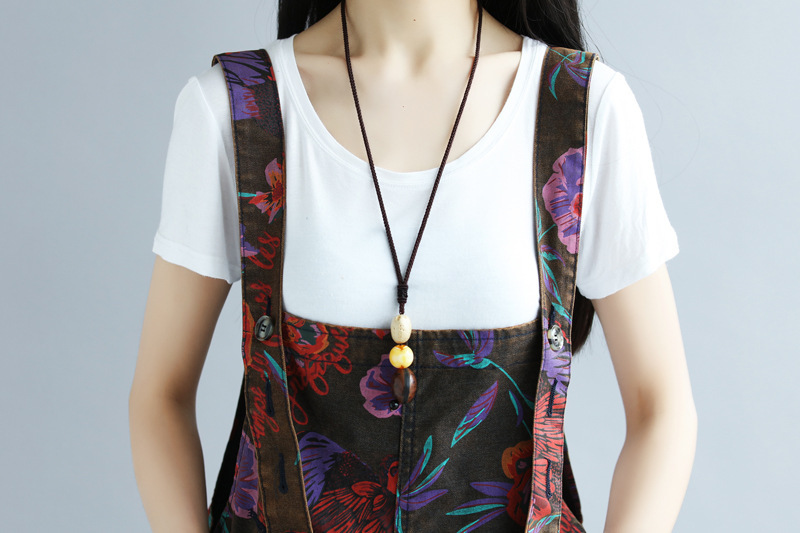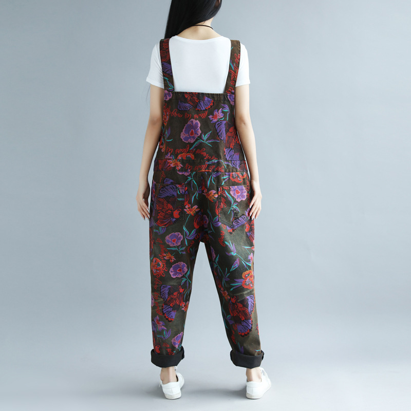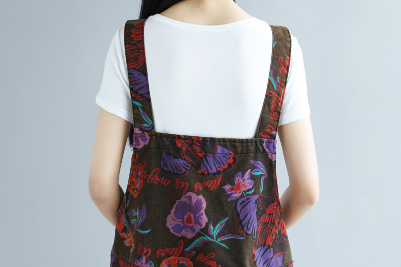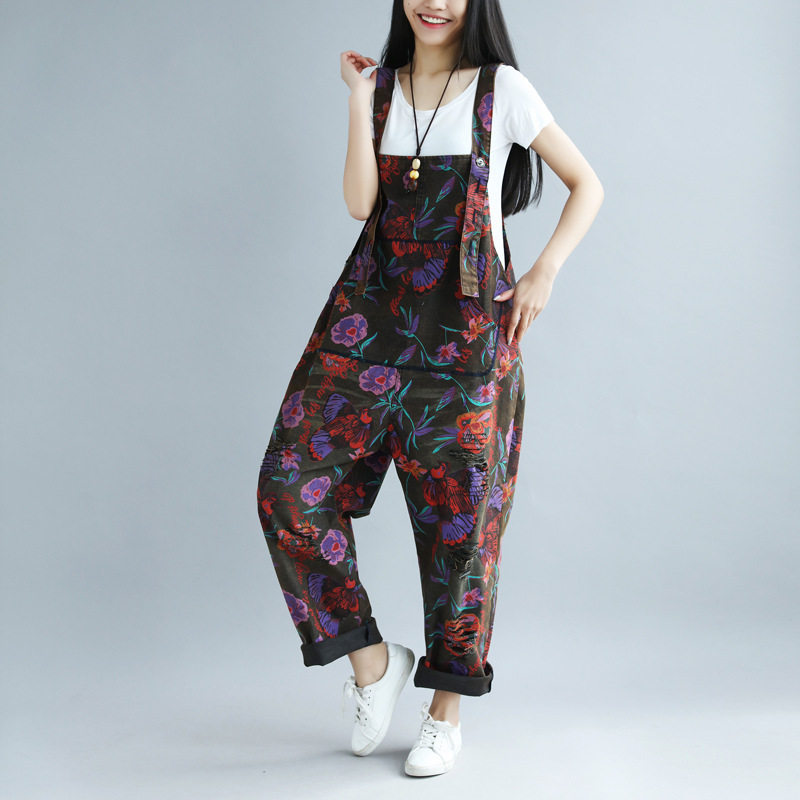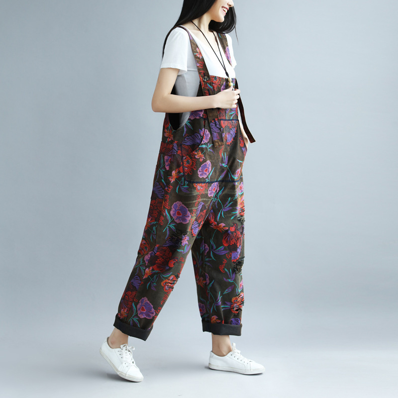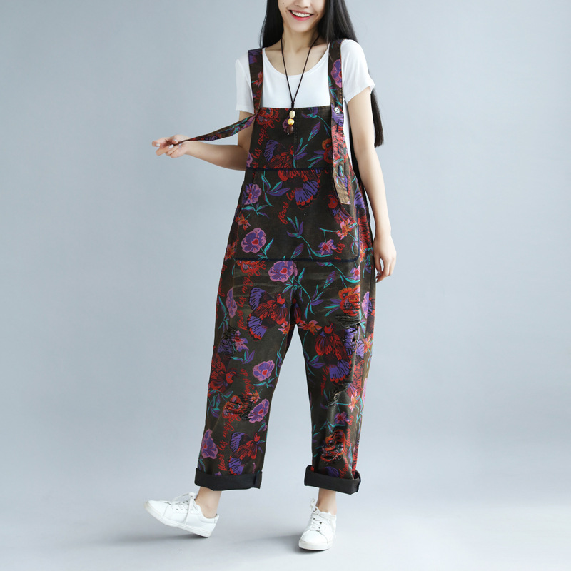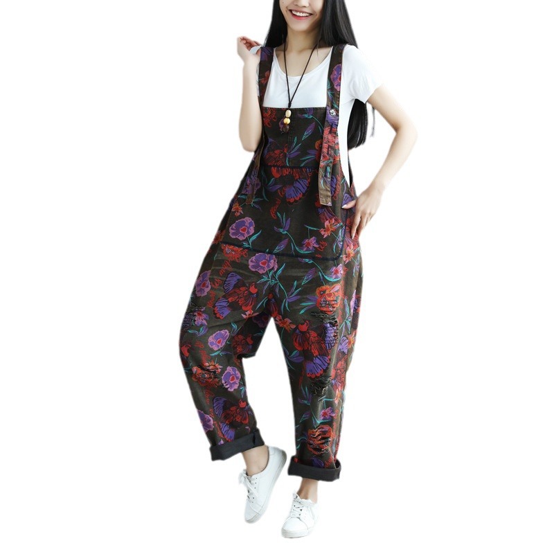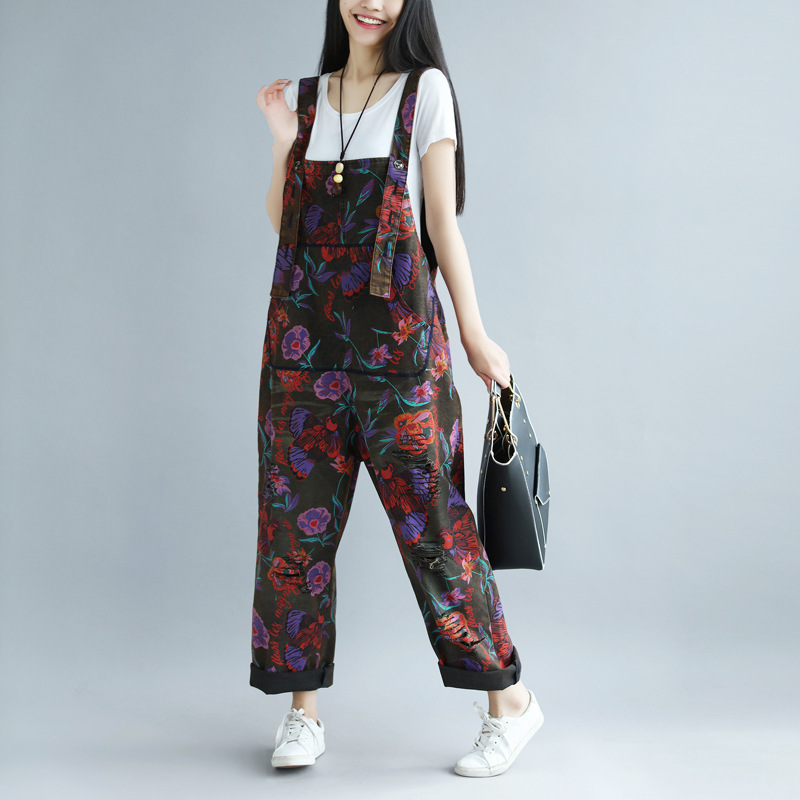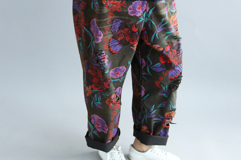 Print Distressed Big Crotch Ripped Pastoral Style Suspender Pants